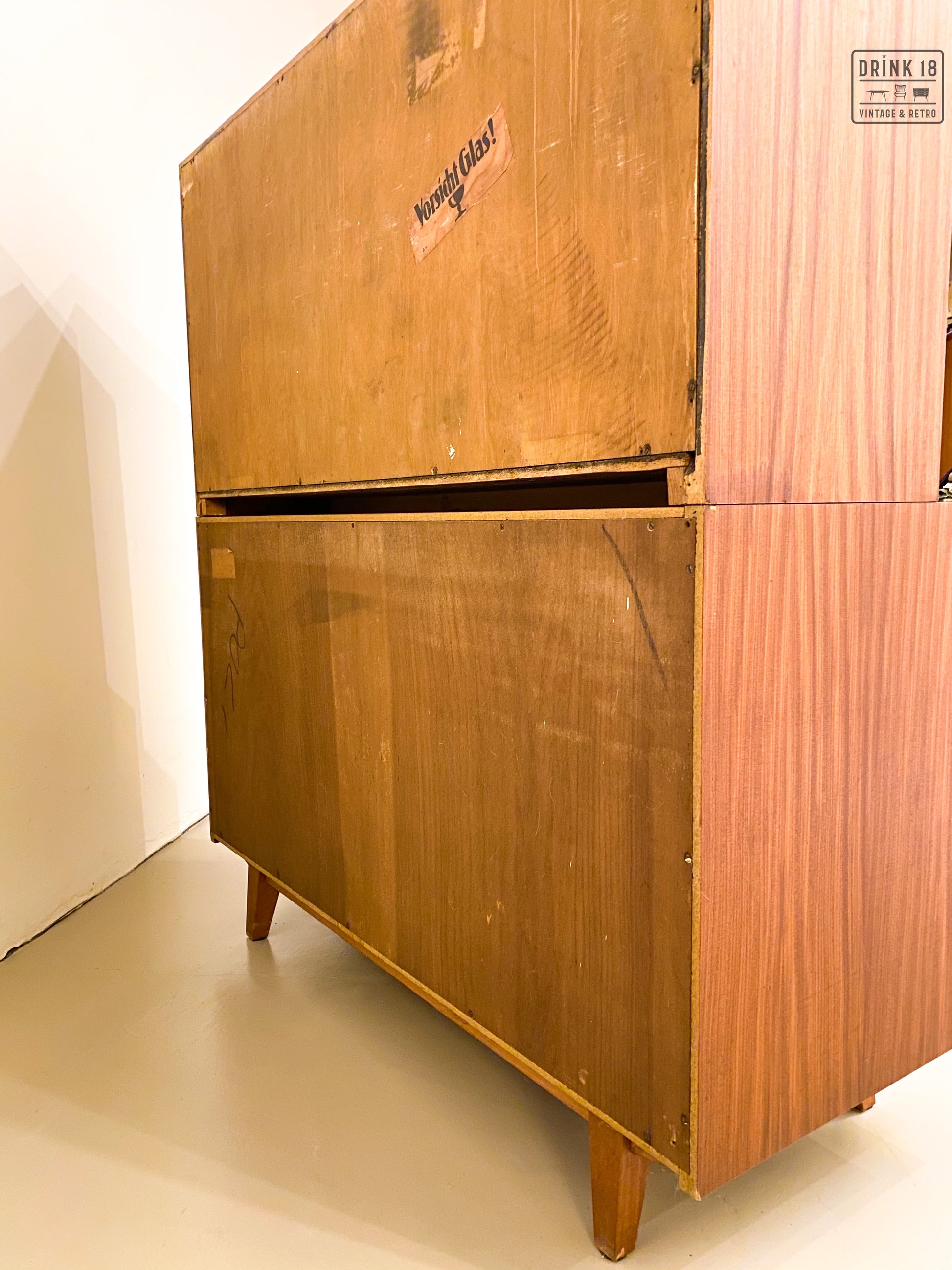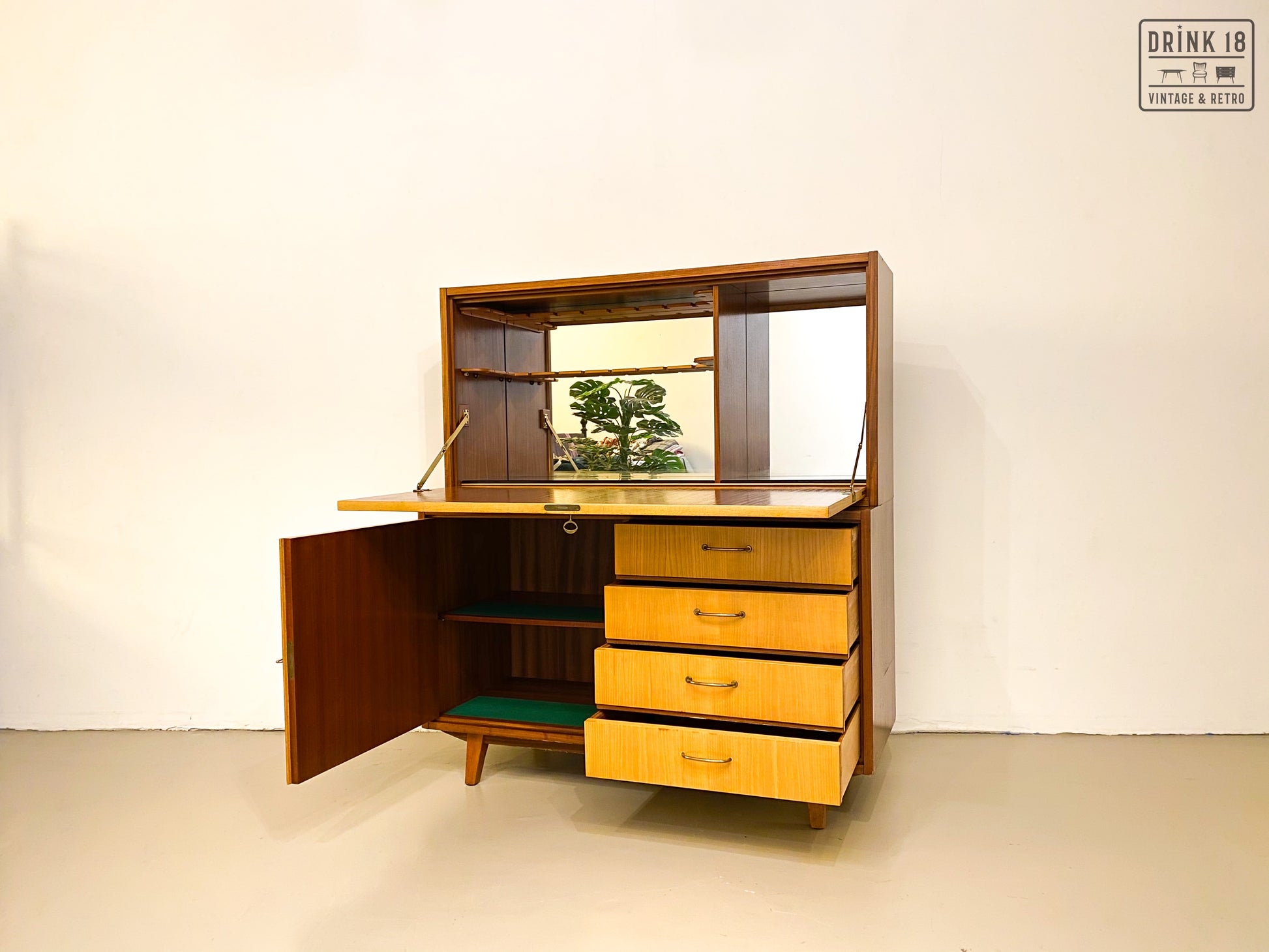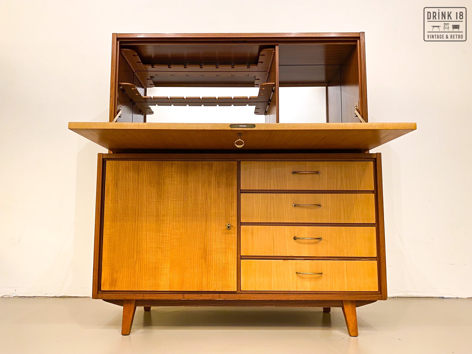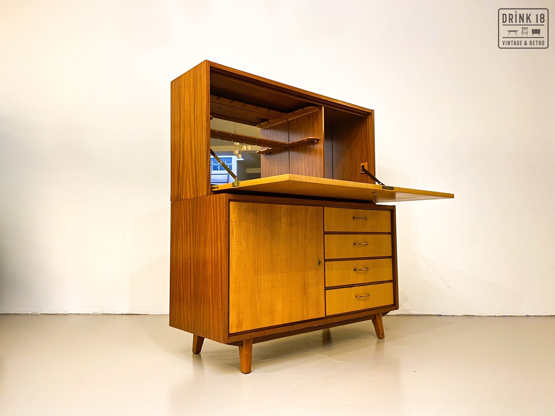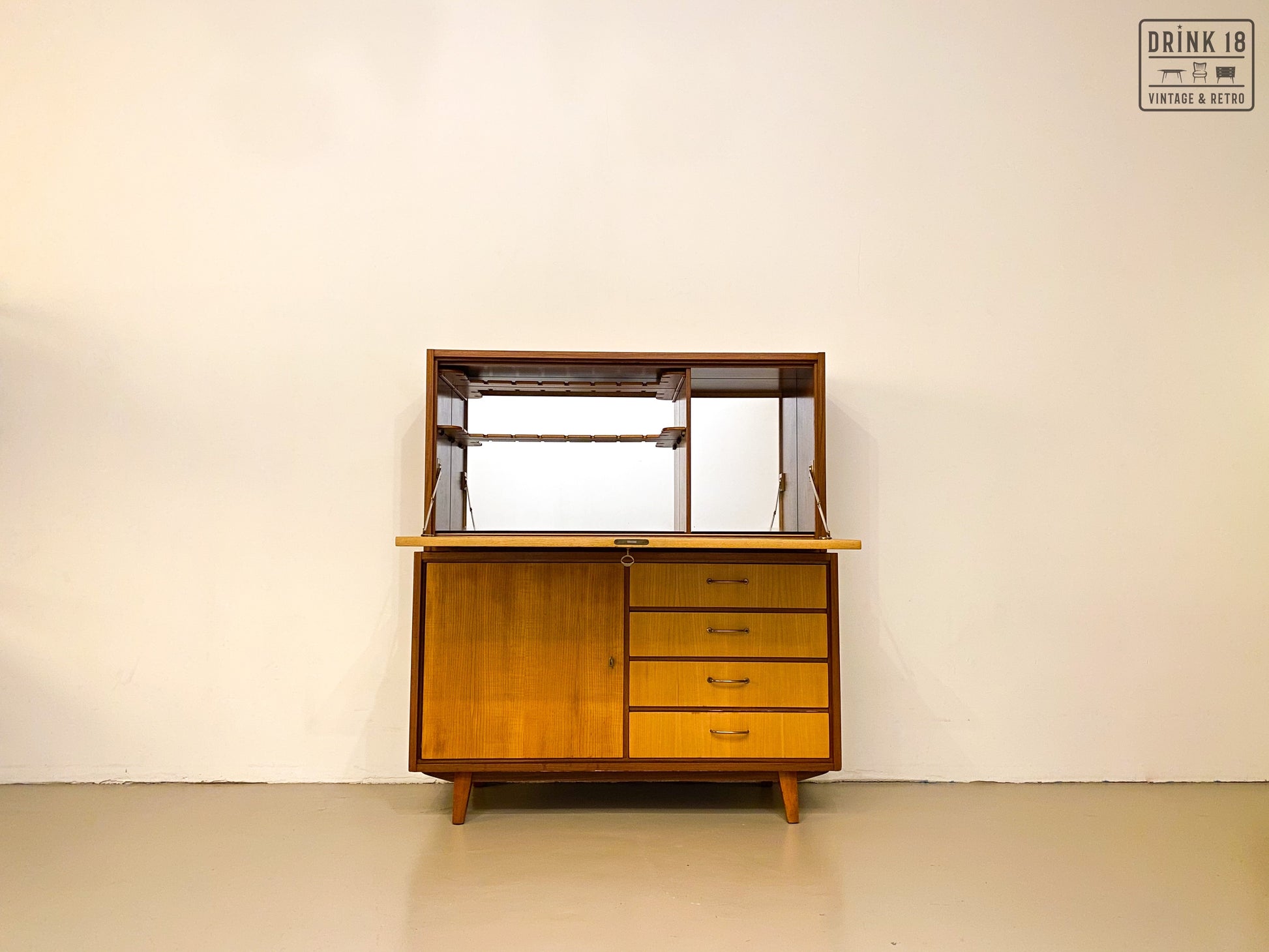 Zeldzame vintage barkast uit de jaren 70 van Meubelen Signa in Mechelen. Bestaat uit een opklapdeurtje, vier lades en een scharnierdeurtje. Bestaat uit twee delen (boven en onderkast). Vervaardigd uit teak hout en teak fineer. Bevindt zich in goede vintage staat.