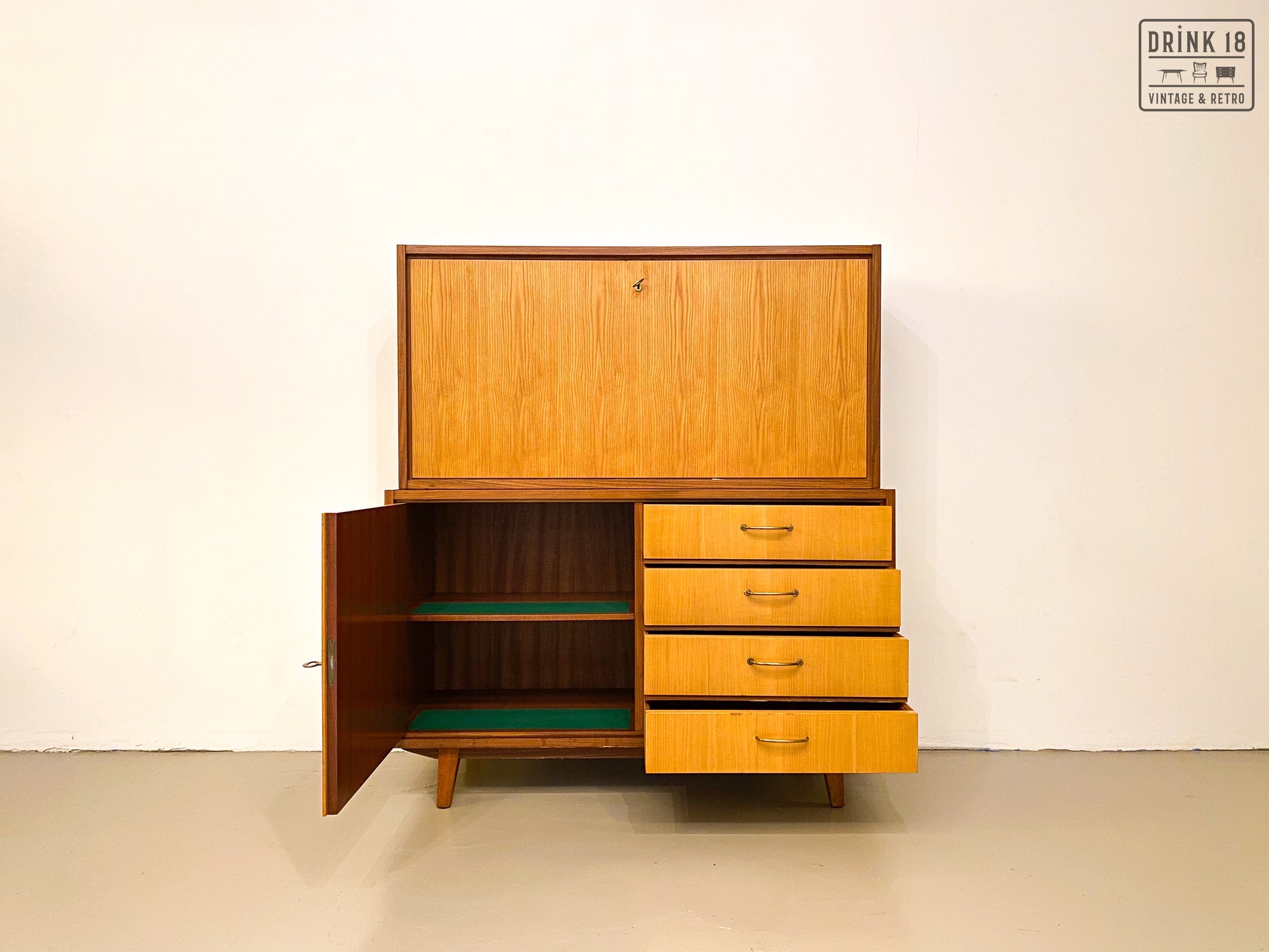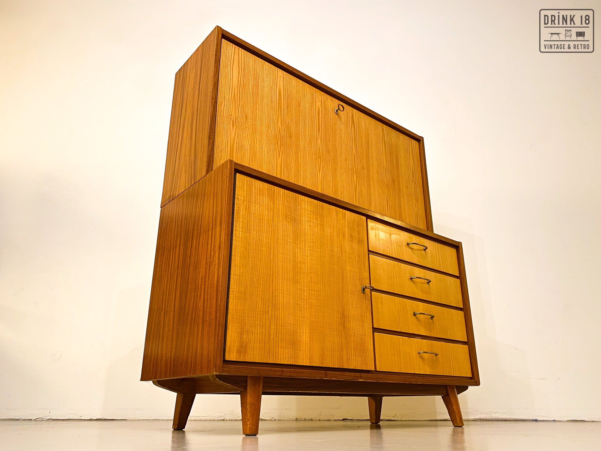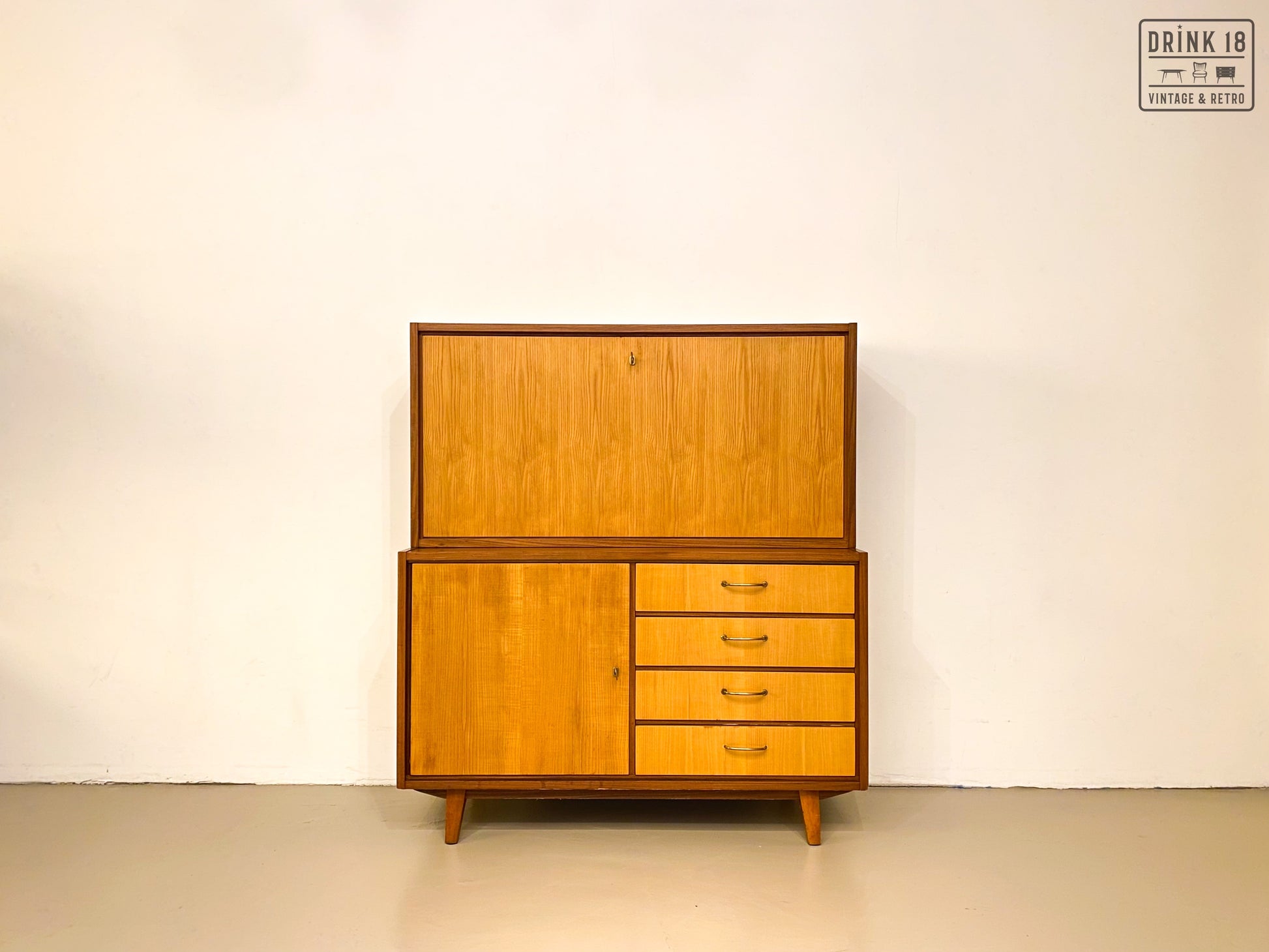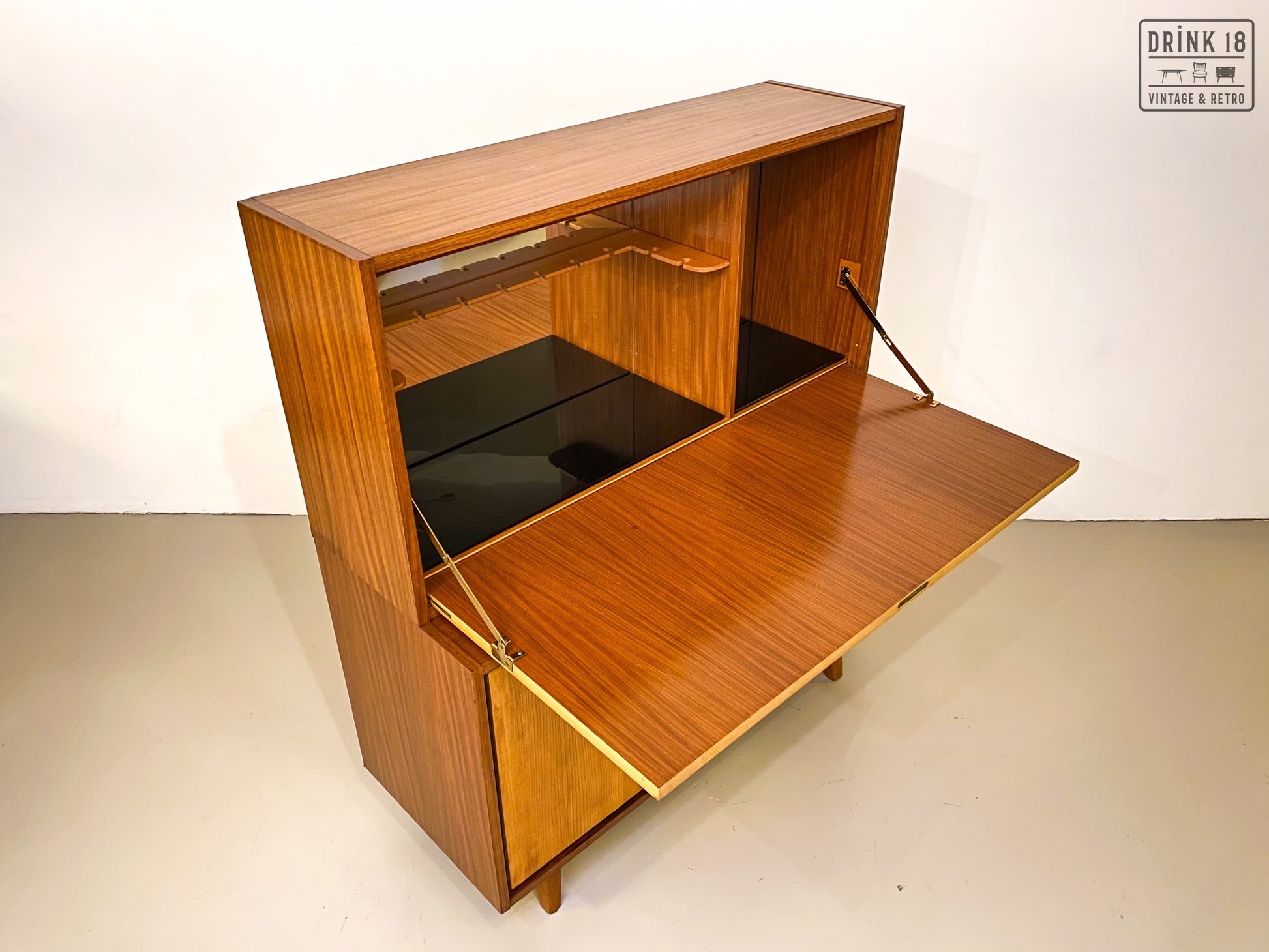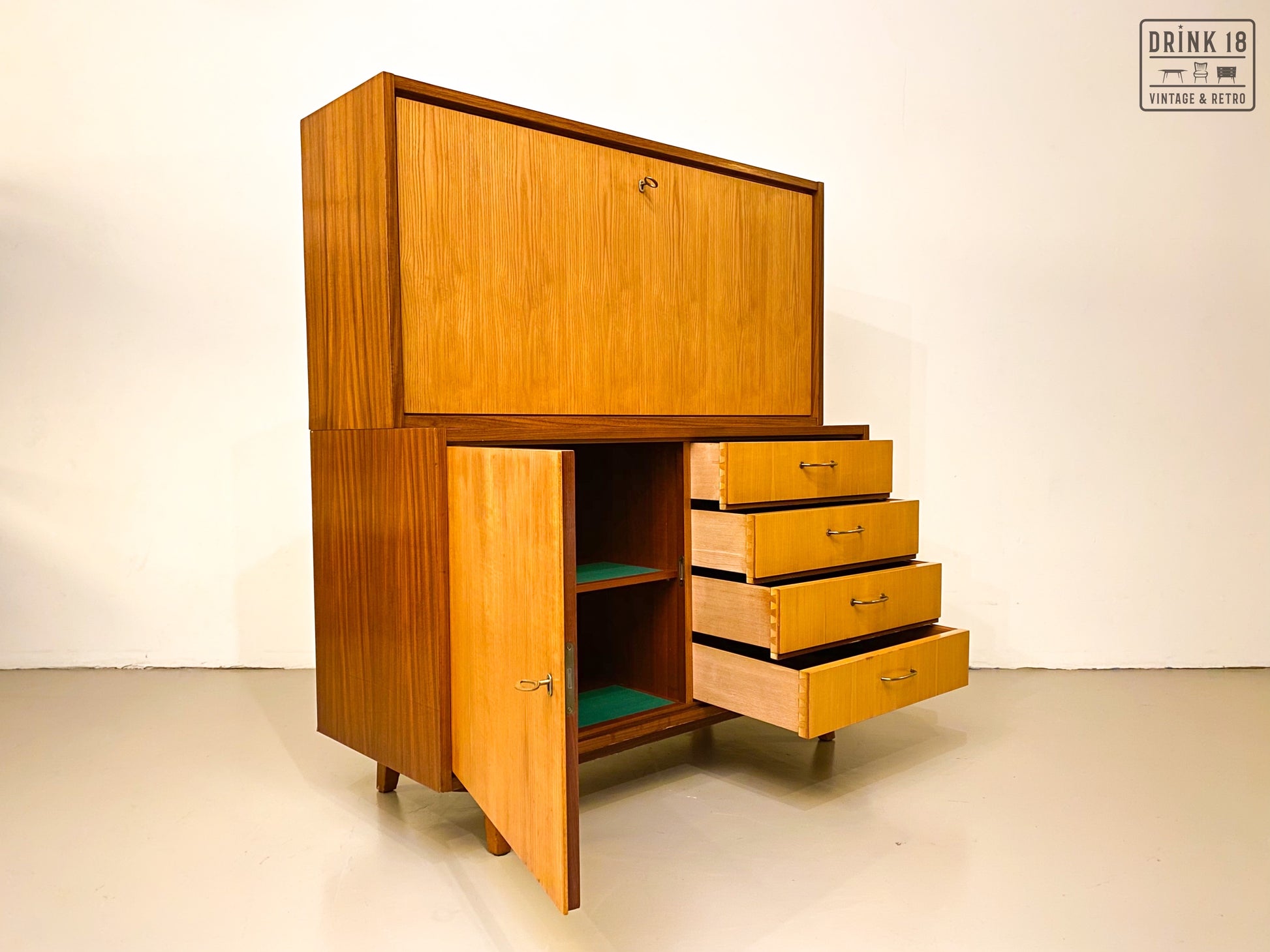 Zeldzame vintage barkast uit de jaren 70 van Meubelen Signa in Mechelen. Bestaat uit een opklapdeurtje, vier lades en een scharnierdeurtje. Bestaat uit twee delen (boven en onderkast). Vervaardigd uit teak hout en teak fineer. Bevindt zich in goede vintage staat.