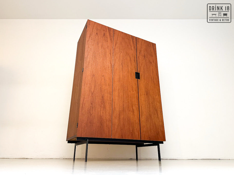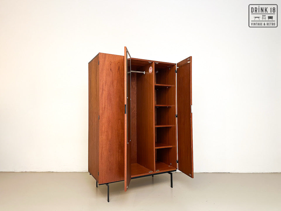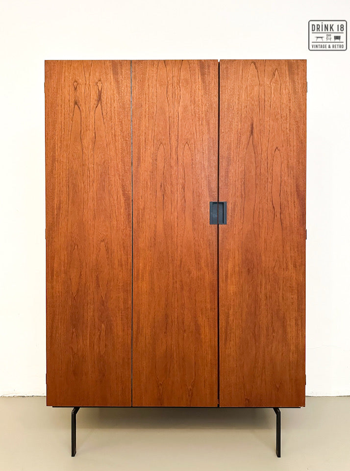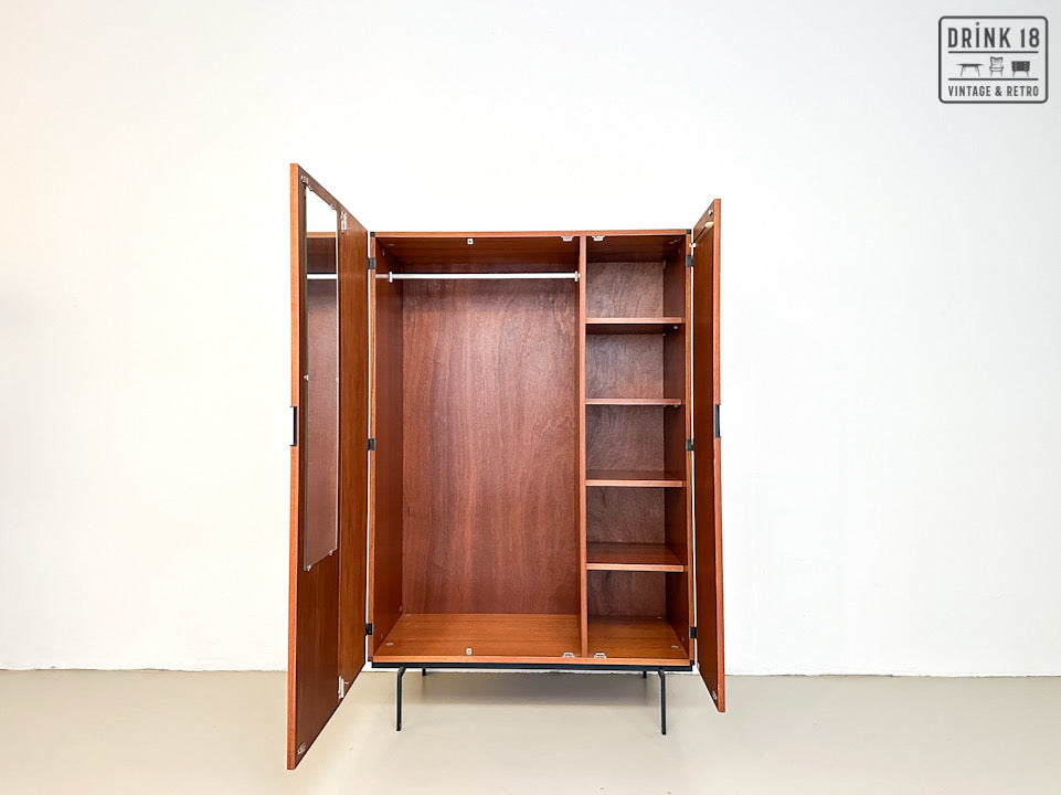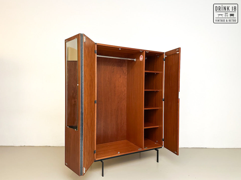 Deze elegante vintage kleerkast is ontworpen door Cees Braakman voor Pastoe in de jaren 60 in Nederland. De kleerkast is afkomstig van de Japanse Serie KU10. Deze heeft twee/drie deuren van teakhout met een extra vouwmechanisme (aan de linkerdeur), waardoor her grote hanggedeelte wordt onthuld. De originele spiegel, deurhanger zijn aanwezig. Iconische vierkante zwarte metalen handvatten en zwart metalen poten maken het tot de zeer herkenbare Japanse serie.