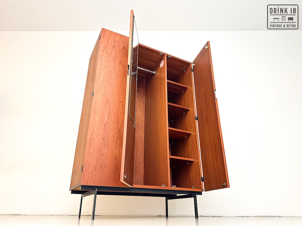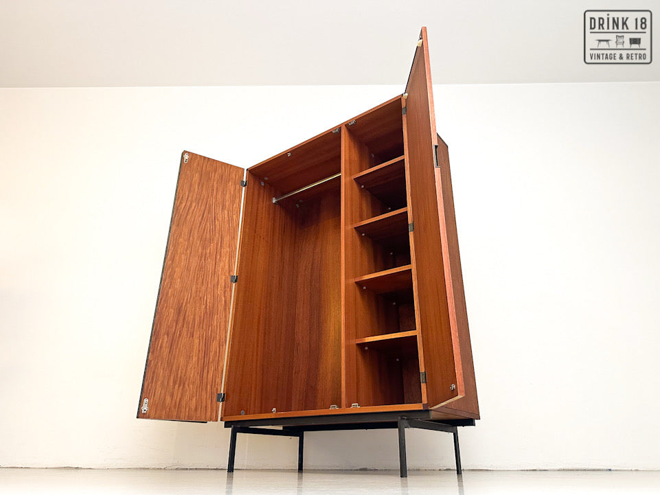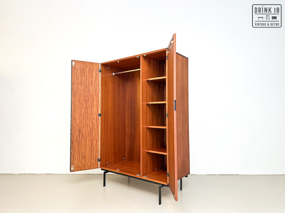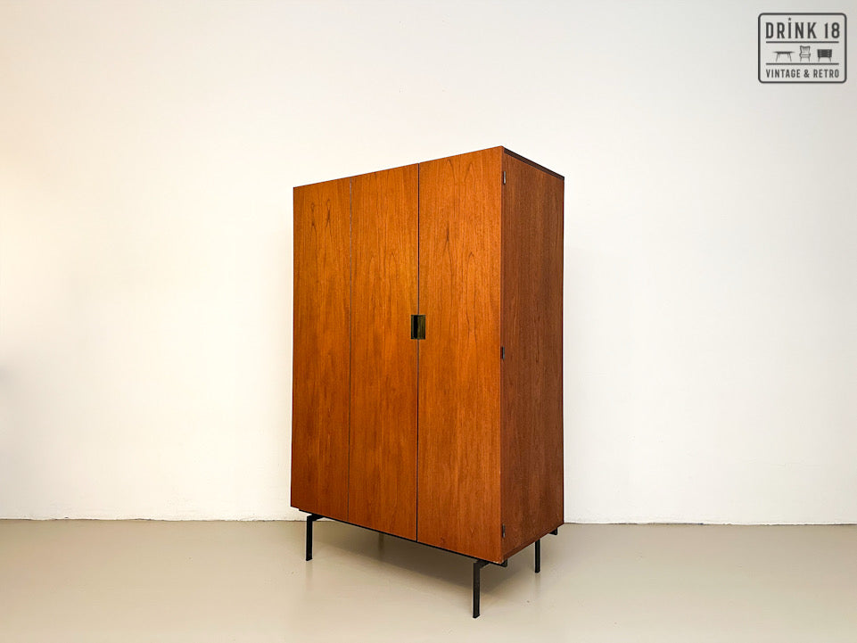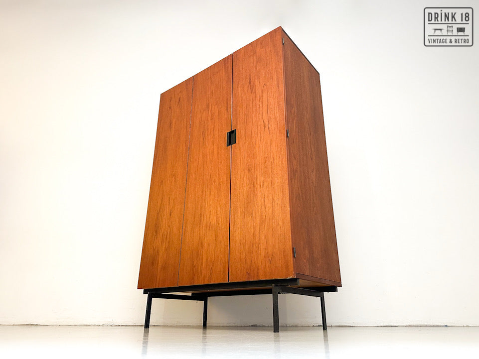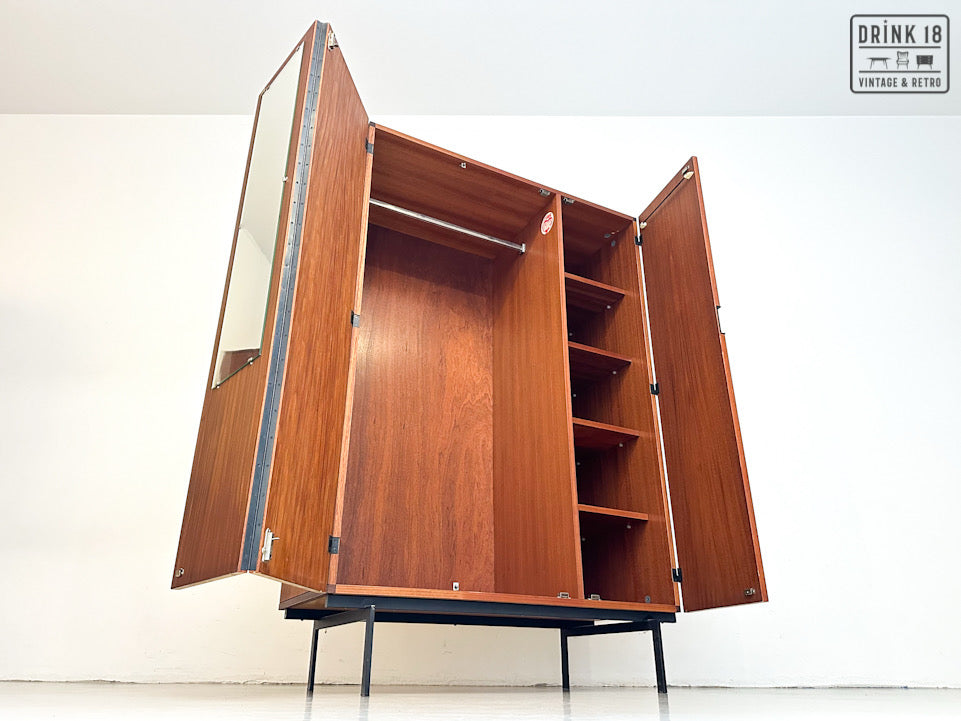 Deze elegante vintage kleerkast is ontworpen door Cees Braakman voor Pastoe in de jaren 60 in Nederland. De kleerkast is afkomstig van de Japanse Serie KU10. Deze heeft twee/drie deuren van teakhout met een extra vouwmechanisme (aan de linkerdeur), waardoor her grote hanggedeelte wordt onthuld. De originele spiegel, deurhanger zijn aanwezig. Iconische vierkante zwarte metalen handvatten en zwart metalen poten maken het tot de zeer herkenbare Japanse serie.