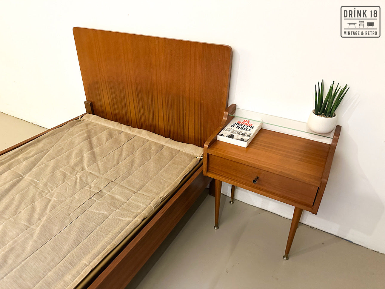 Vintage eenpersoonsbed en nachtkastje uit de jaren 60 van MDK. De set is vervaardigd uit teak hout en teak fineer en bevindt zich, buiten wat gevruikssporen, conform de leeftijd, nog in goede vintage staat