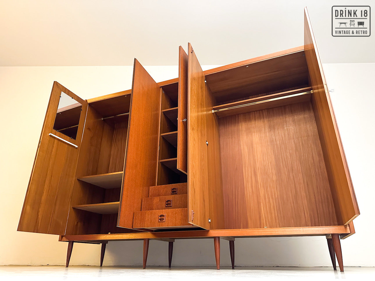 Deze zeldzame kleerkast uit de jaren 60 is een prachtig design van topkwaliteit. Dit pronkstuk heeft aan zowel de rechter als linkerkant een roede (B:97,5cm) met onderaan een legplankje (rechts) en helemaal onderdaan (links) twee legplanken. In het middengedeelte van de kleerkast bevinden zicht vier legplanken.