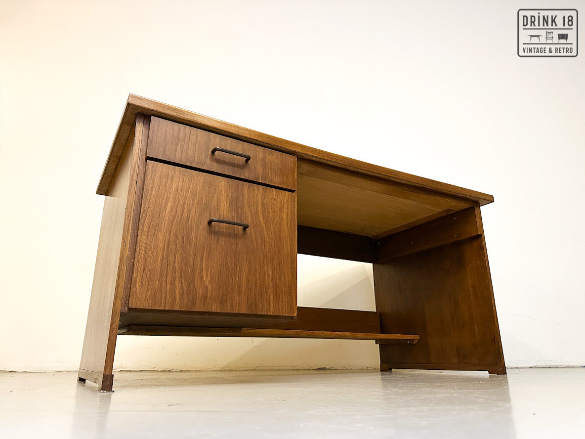 Dit stijlvolle vintage bureau combineert een warme houtafwerking met een strak, functioneel ontwerp. De sobere lijnen en doordachte indeling geven het bureau een tijdloze uitstraling met duidelijke mid-century invloeden — ideaal voor wie houdt van rust, orde en karakter in de werkruimte.