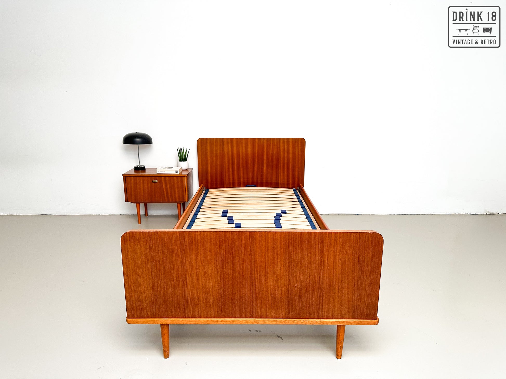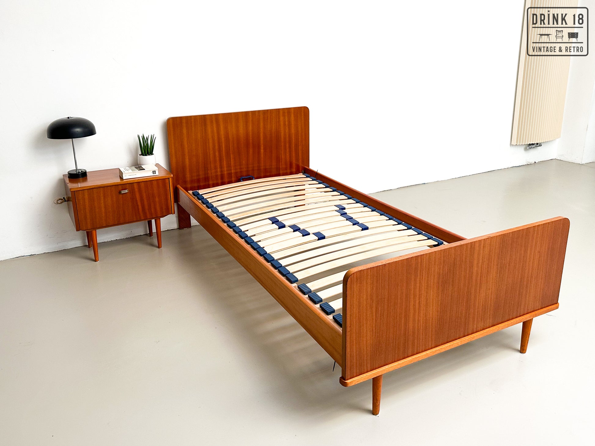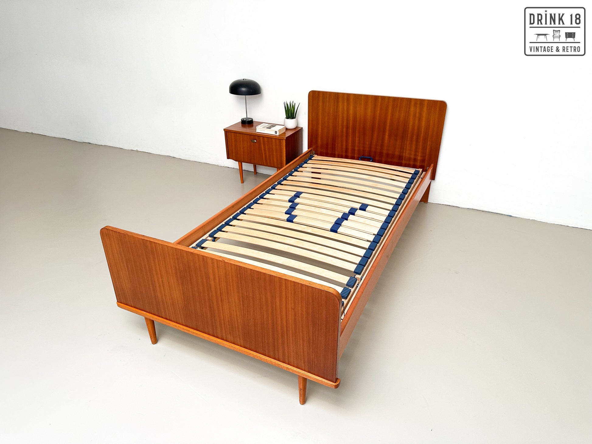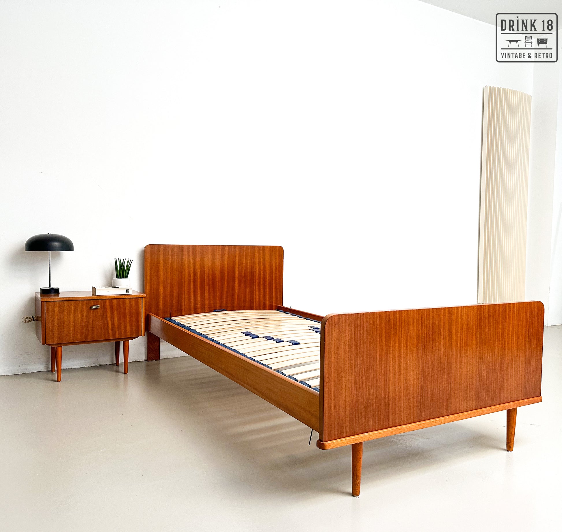 Vintage eenpersoonsbed en nachtkastje uit de jaren 60 dat bestaat uit teak hout en teak fineer. De set bevindt zich in goede vintage staat. Nachtkastje heeft één opklapdeurtje, een metalen handvatje en rust op vier teak houten poten. Lattenbodem onbegrepen.