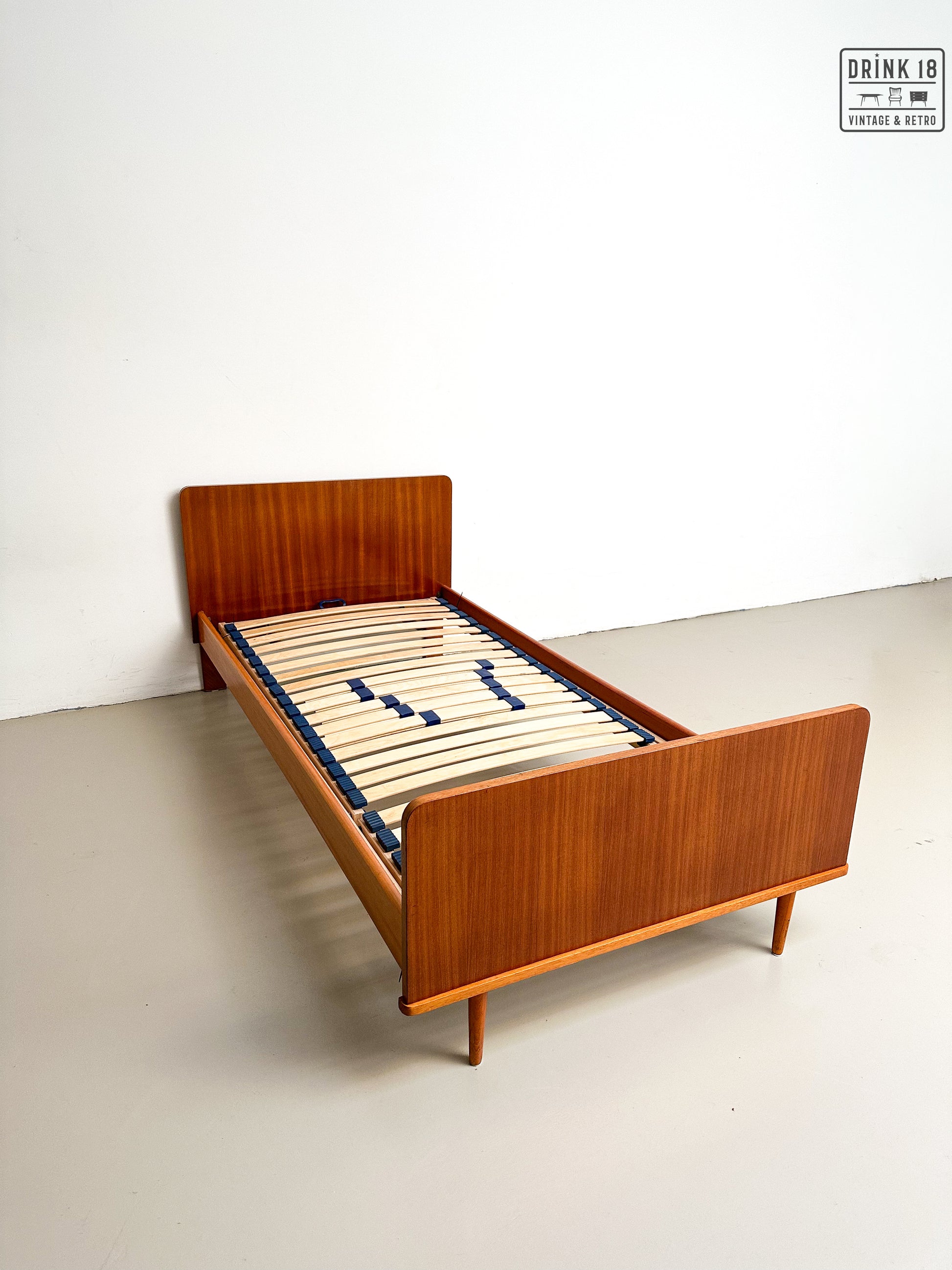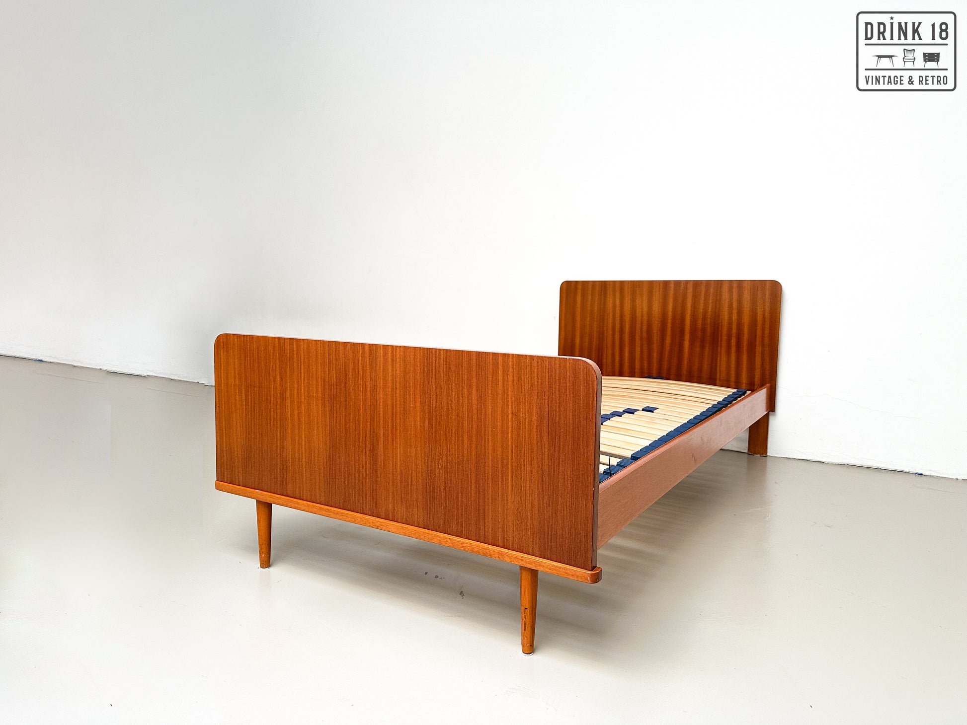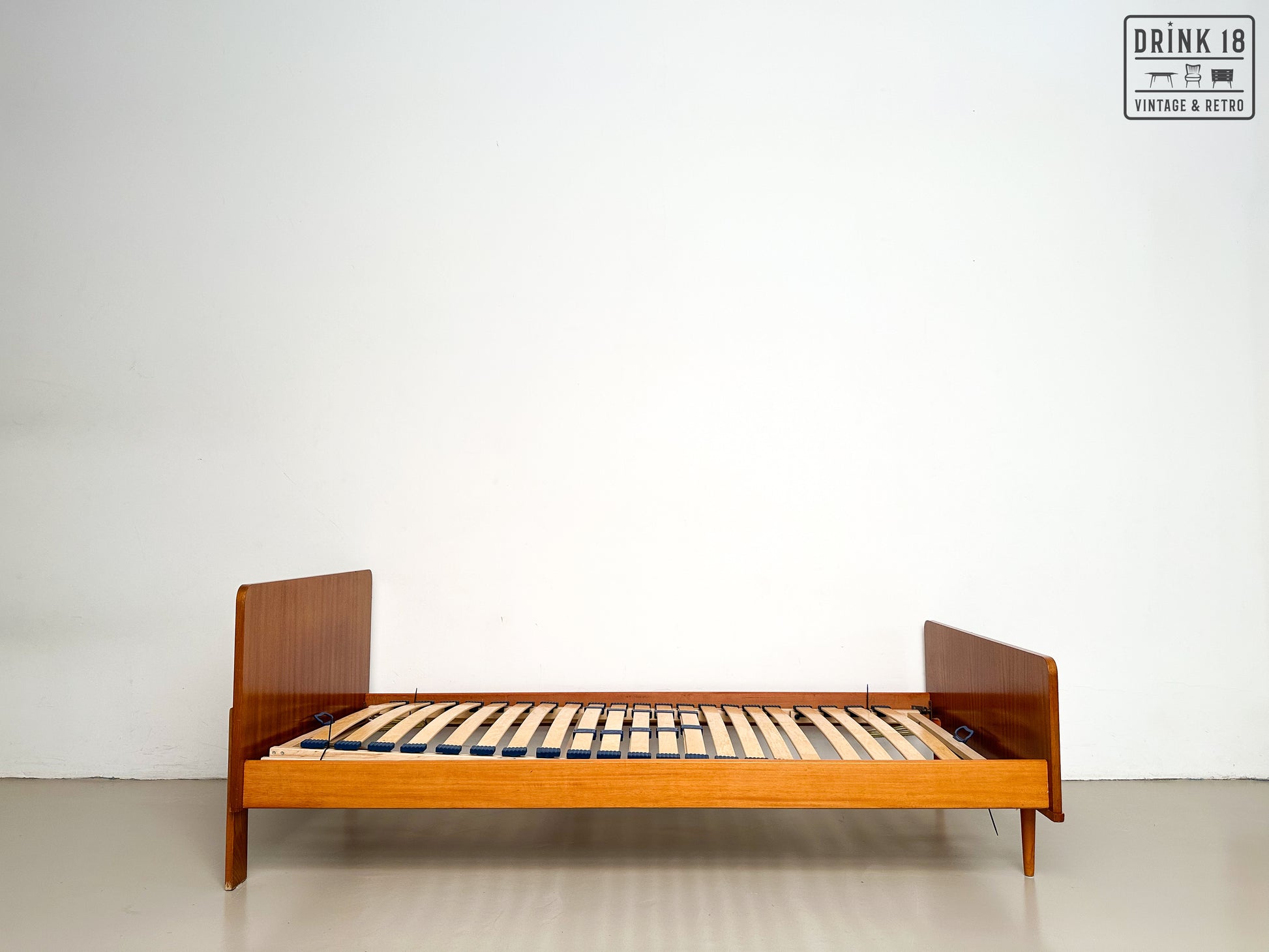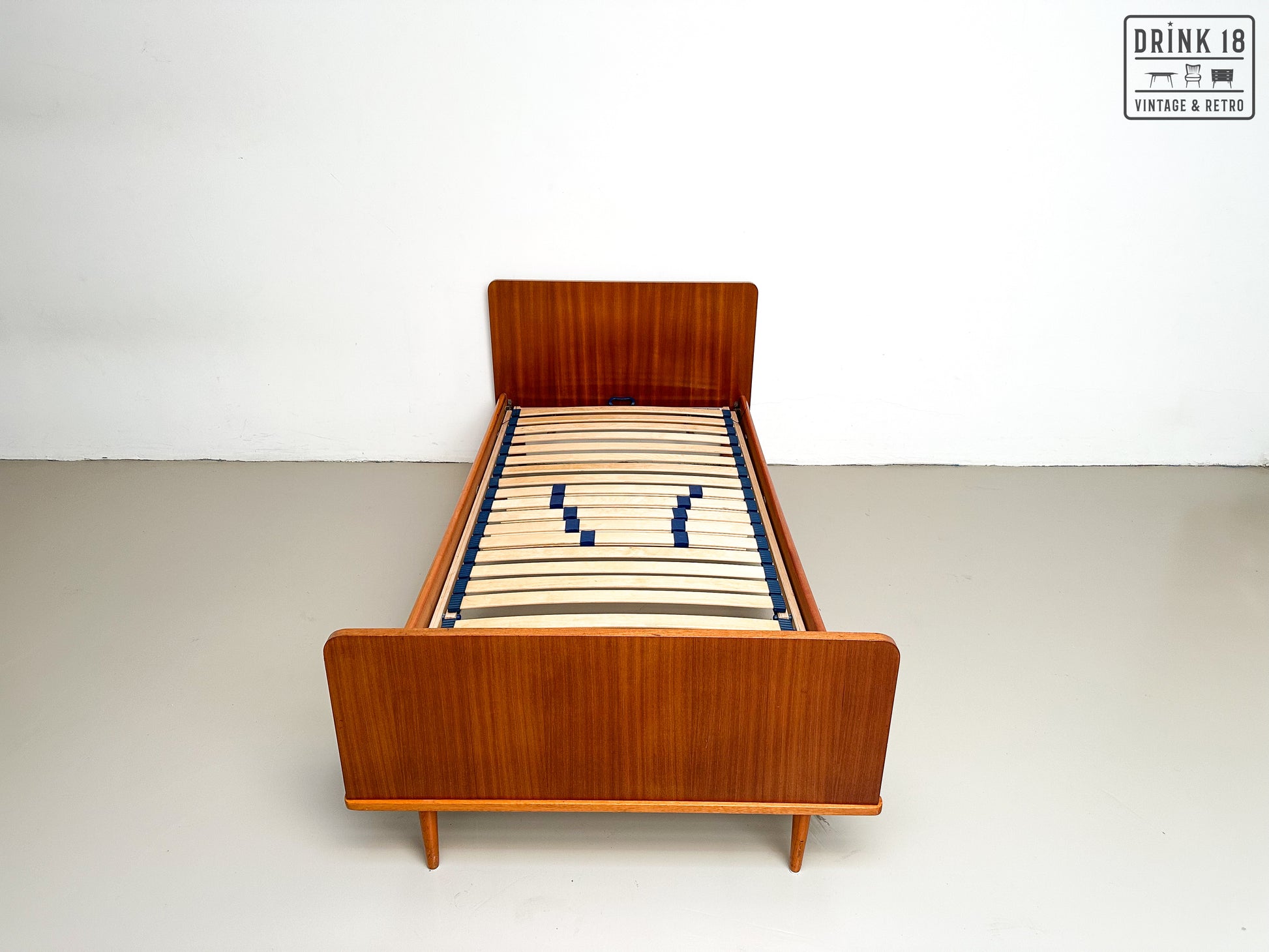 Vintage eenpersoonsbed en nachtkastje uit de jaren 60 dat bestaat uit teak hout en teak fineer. De set bevindt zich in goede vintage staat. Nachtkastje heeft één opklapdeurtje, een metalen handvatje en rust op vier teak houten poten. Lattenbodem onbegrepen.