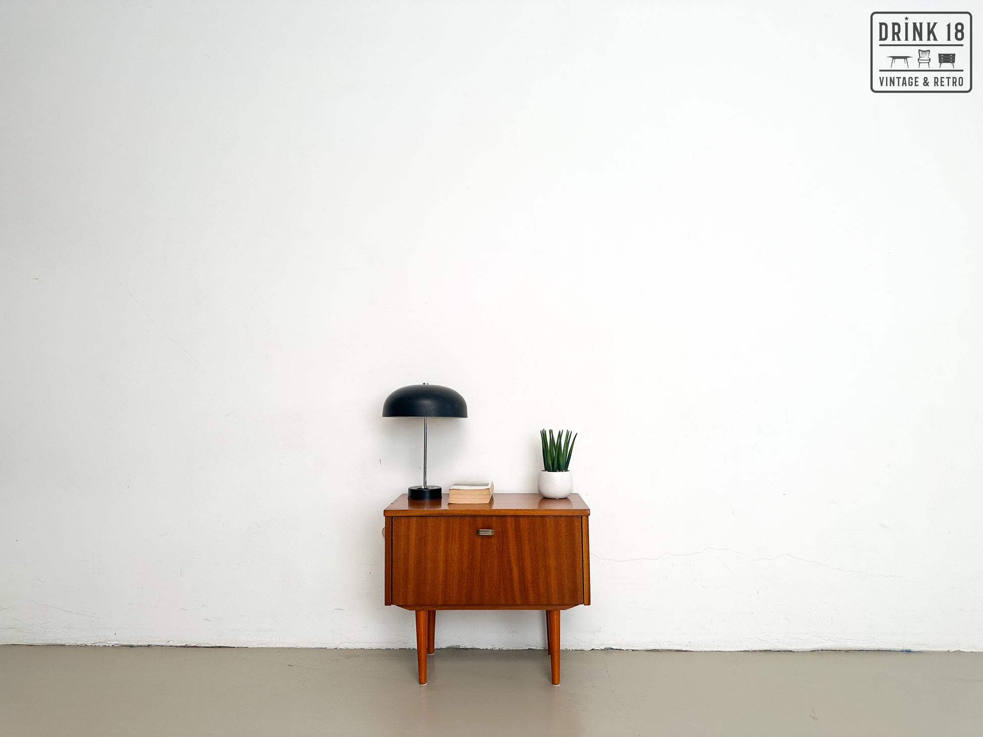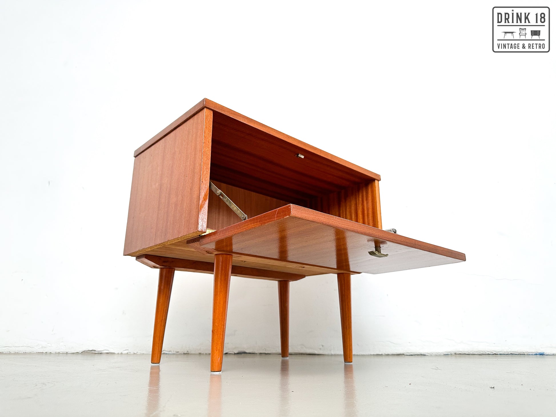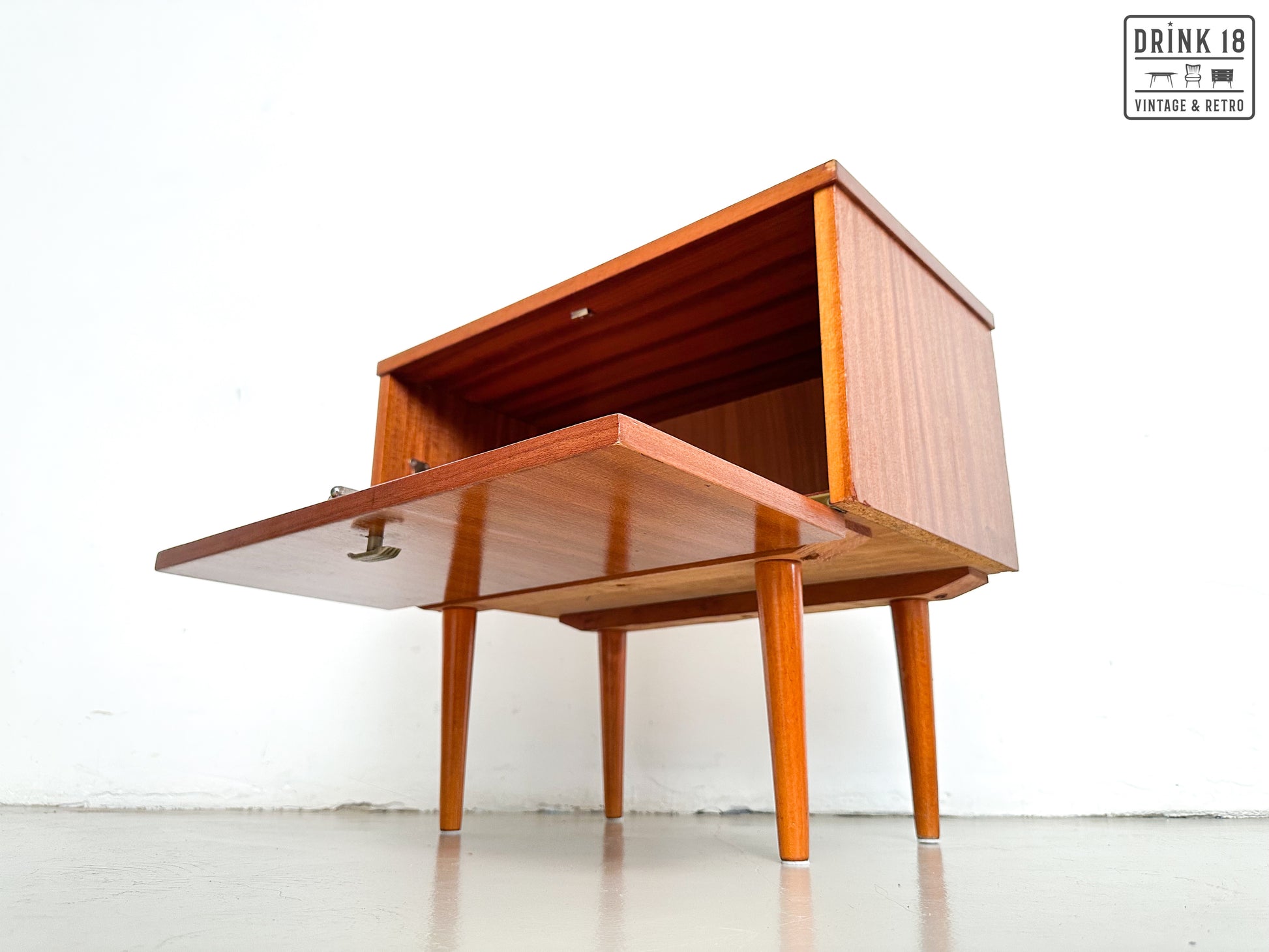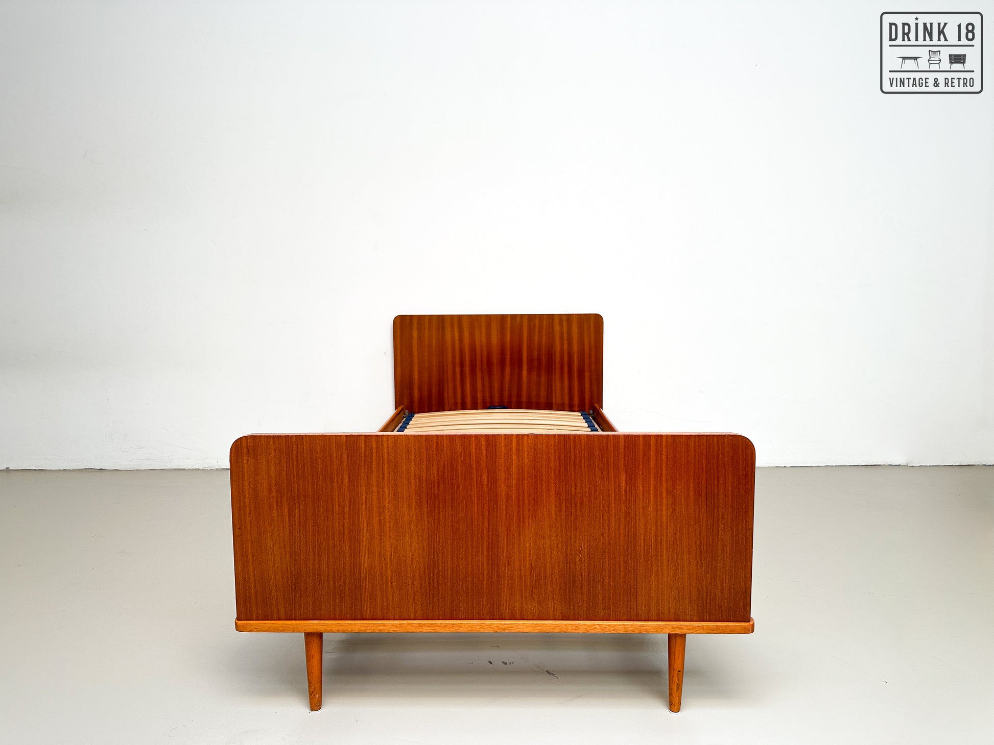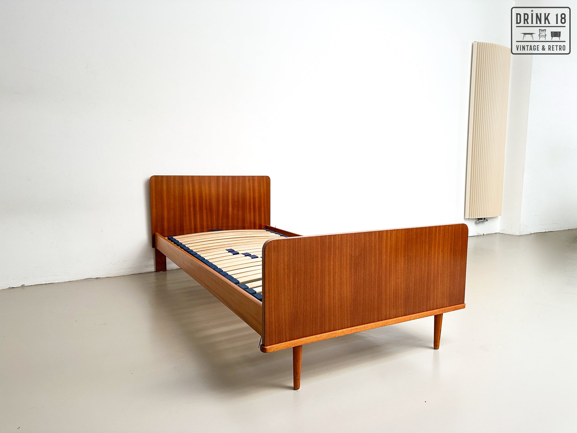 Vintage eenpersoonsbed en nachtkastje uit de jaren 60 dat bestaat uit teak hout en teak fineer. De set bevindt zich in goede vintage staat. Nachtkastje heeft één opklapdeurtje, een metalen handvatje en rust op vier teak houten poten. Lattenbodem onbegrepen.