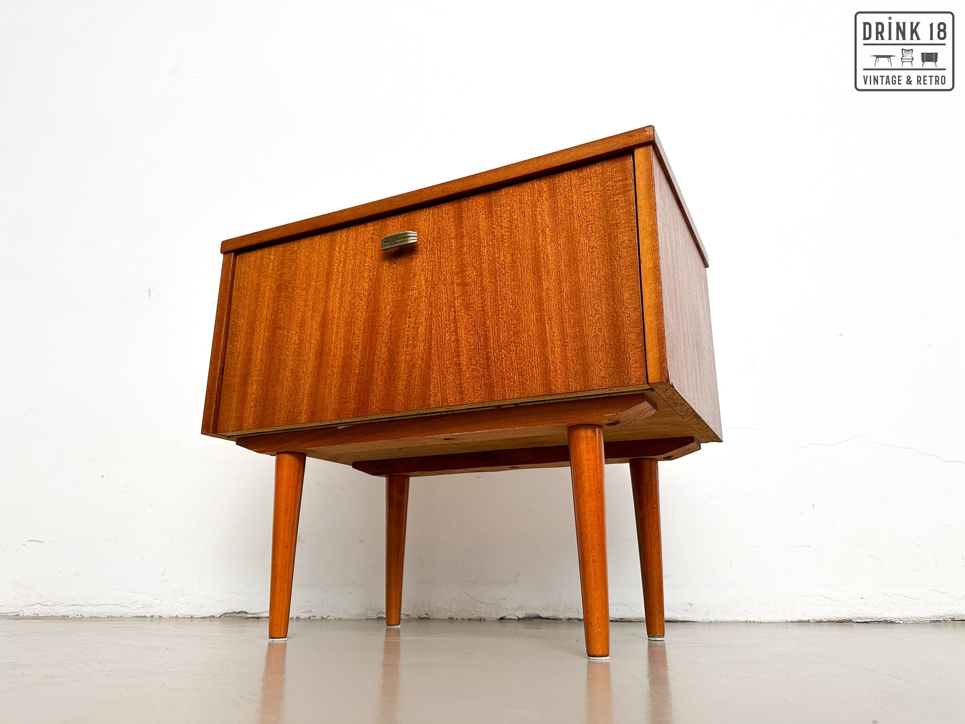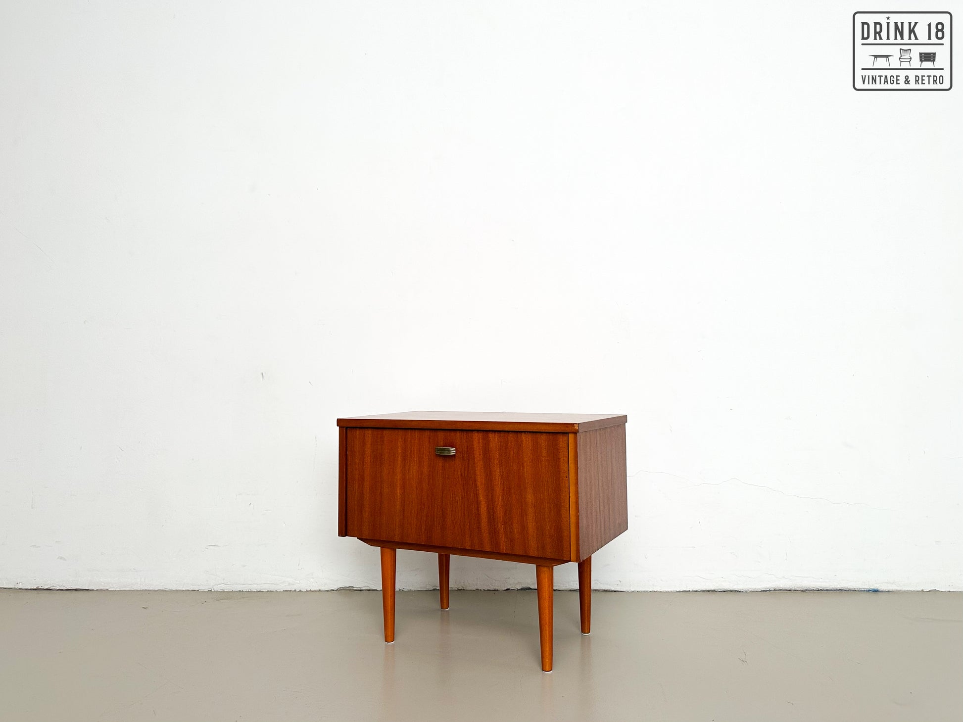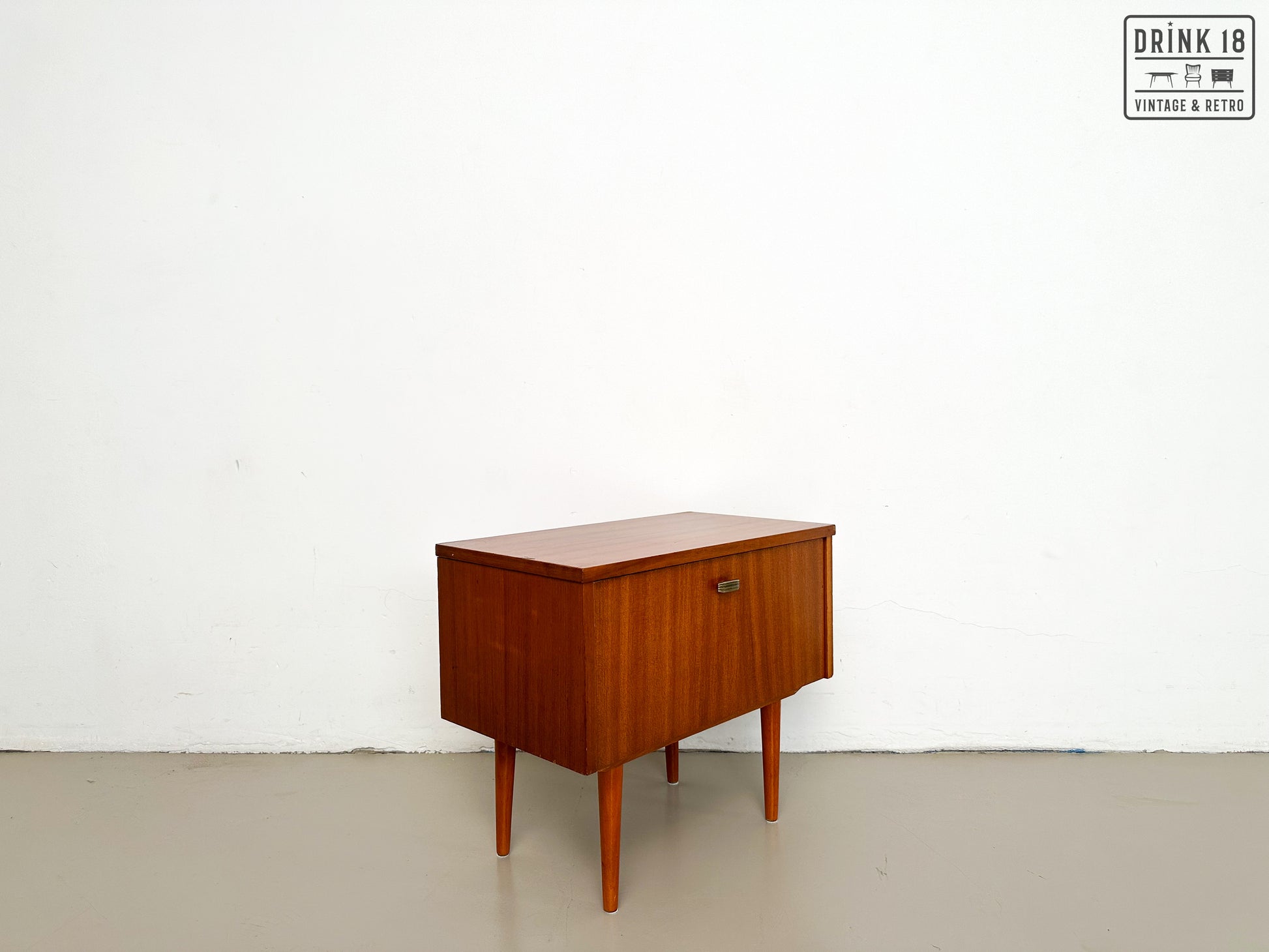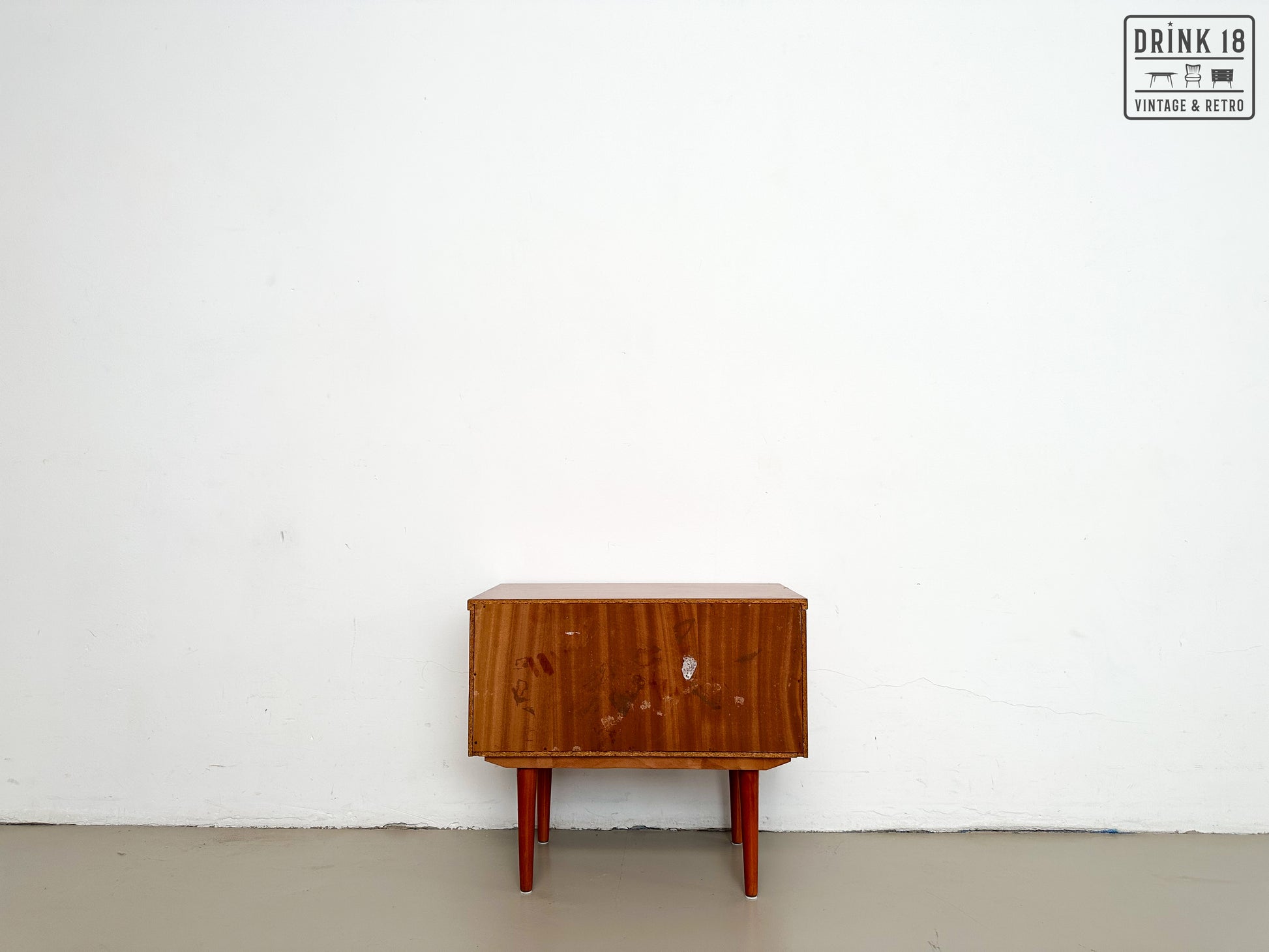 Vintage eenpersoonsbed en nachtkastje uit de jaren 60 dat bestaat uit teak hout en teak fineer. De set bevindt zich in goede vintage staat. Nachtkastje heeft één opklapdeurtje, een metalen handvatje en rust op vier teak houten poten. Lattenbodem onbegrepen.