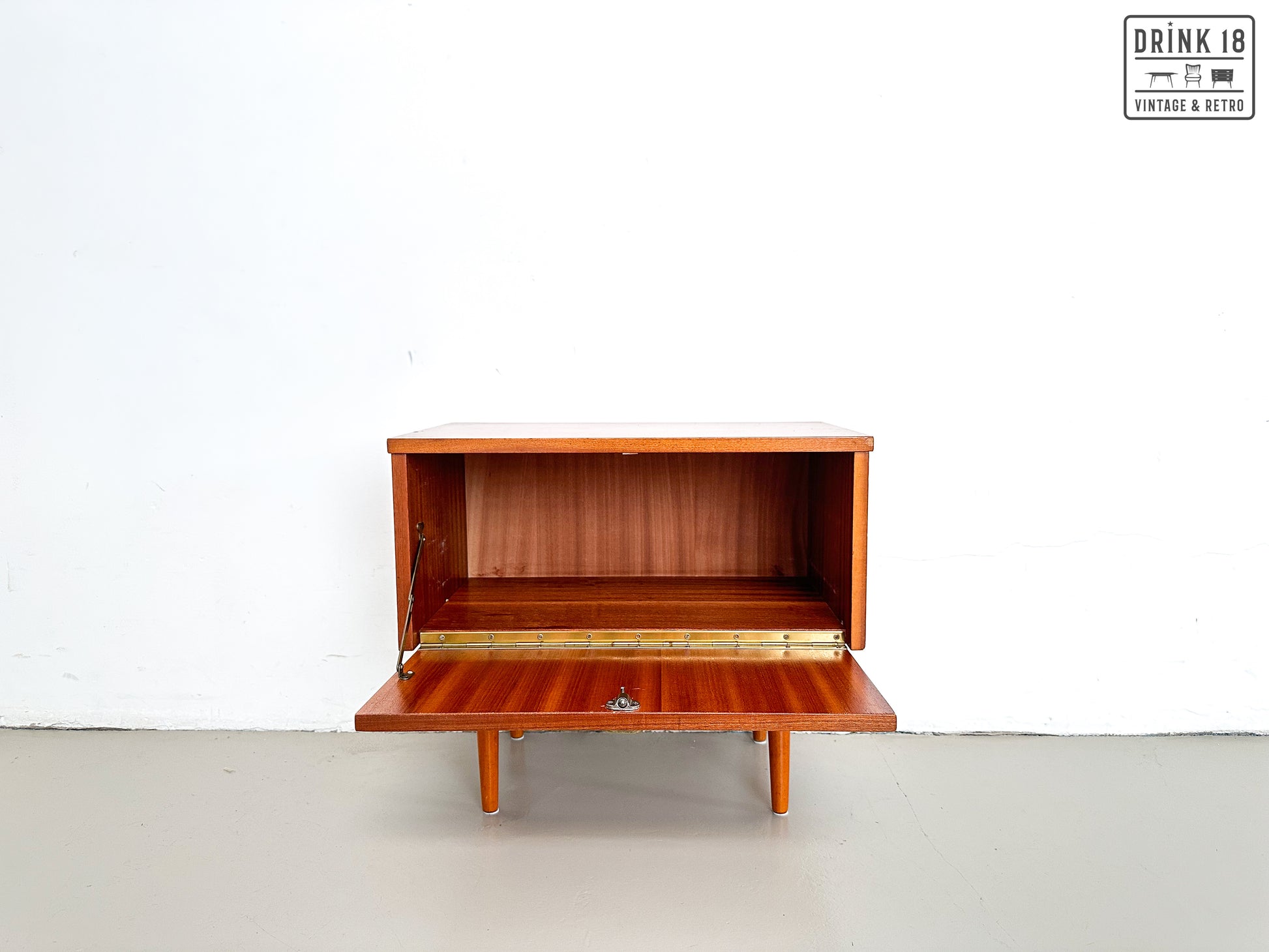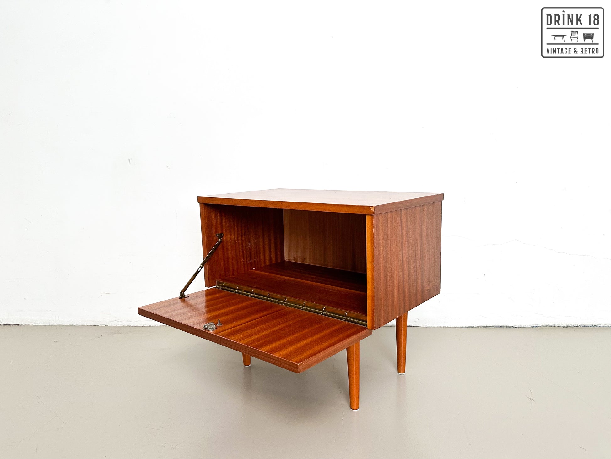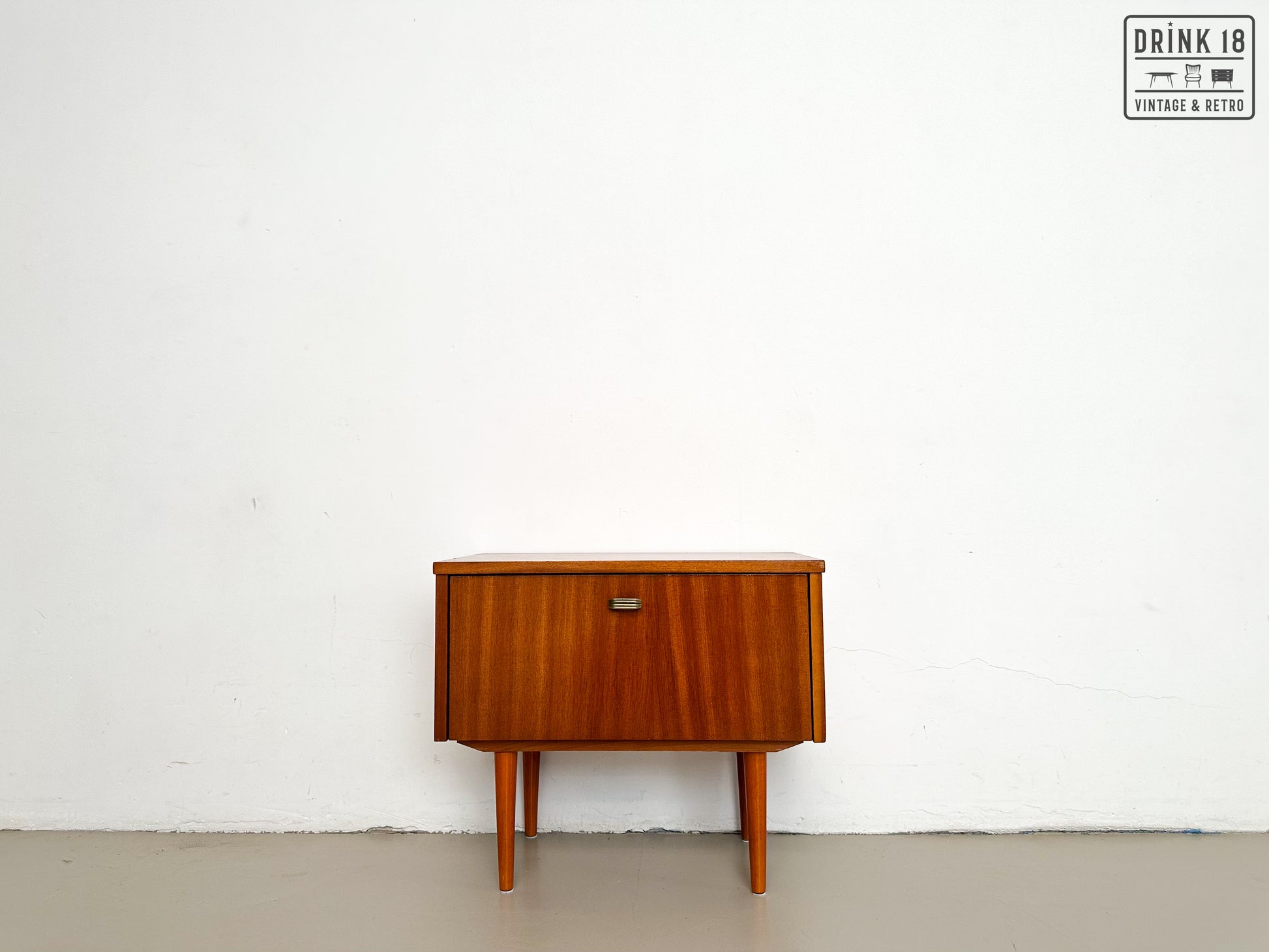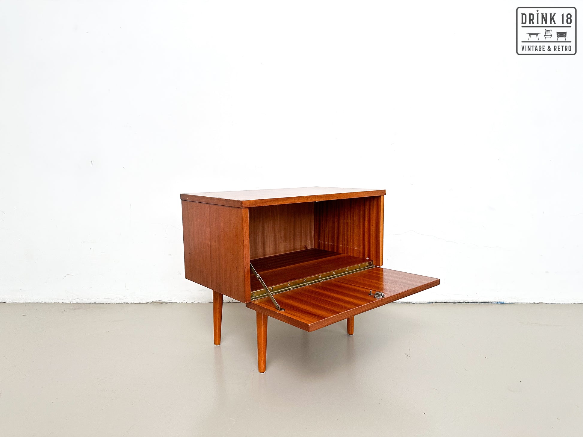 Vintage eenpersoonsbed en nachtkastje uit de jaren 60 dat bestaat uit teak hout en teak fineer. De set bevindt zich in goede vintage staat. Nachtkastje heeft één opklapdeurtje, een metalen handvatje en rust op vier teak houten poten. Lattenbodem onbegrepen.
