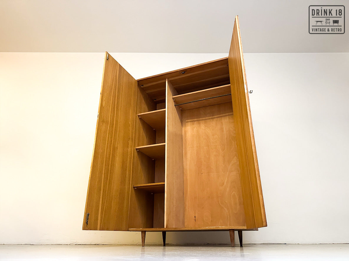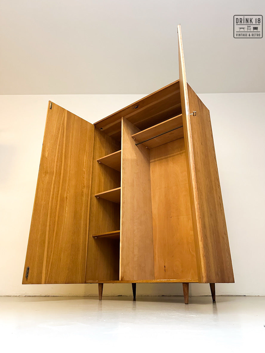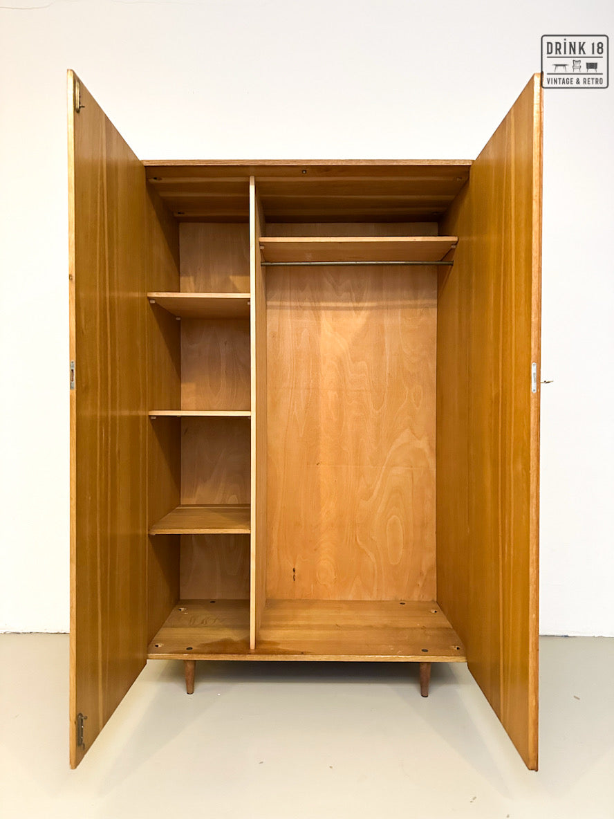 Deze elegante vintage kleerkast is een tijdloos en praktisch meubel, ideaal voor één persoon. De warme eikenhouten uitstraling en slanke poten geven de kast een rustige, mid-century geïnspireerde look die moeiteloos past in zowel vintage als moderne interieurs.