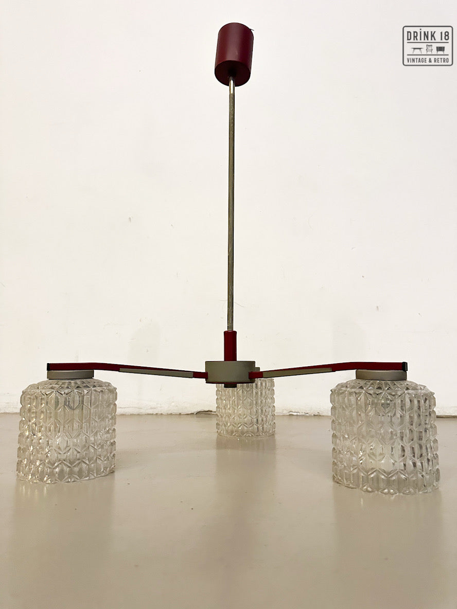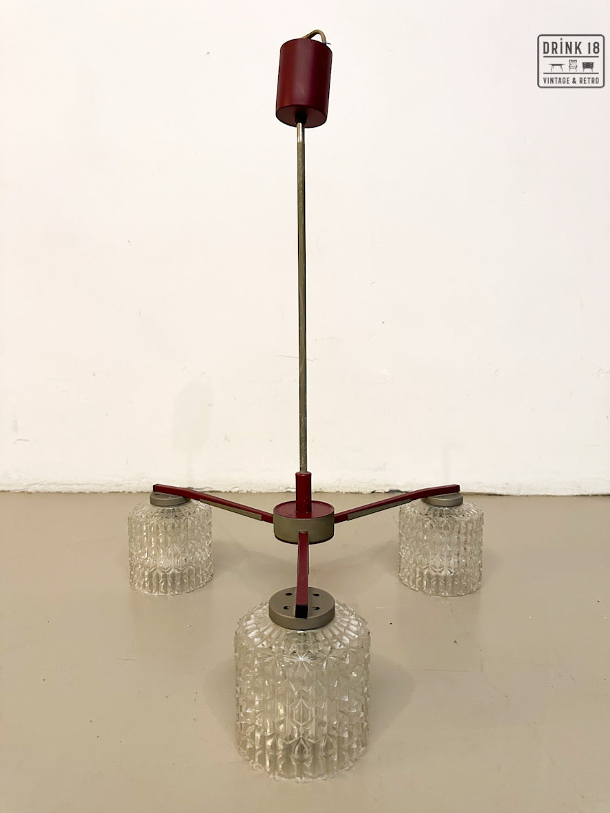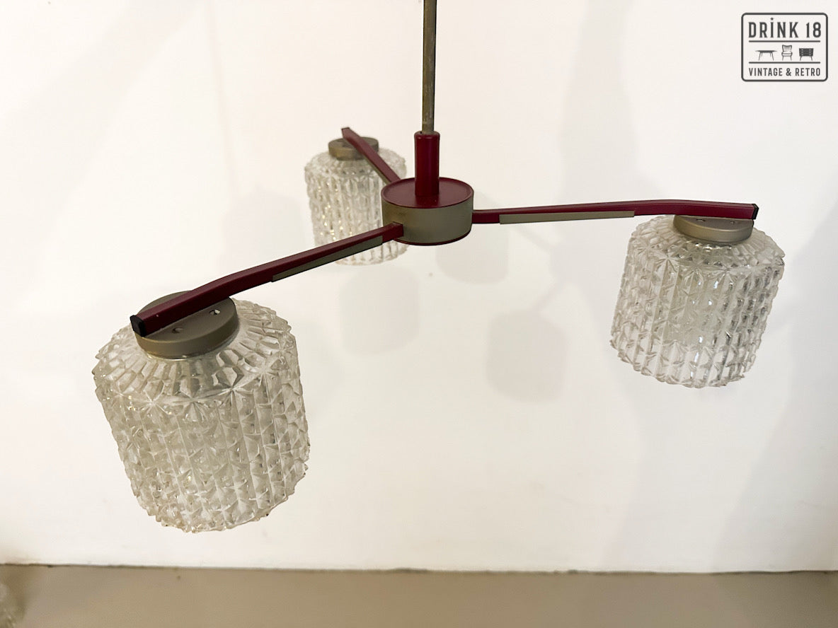 Deze vintage hanglamp is een prachtig voorbeeld van design uit de jaren '60 of '70. De lamp heeft een stevige, metalen basis in een bordeaux kleur, met drie armen die speels uitsteken. Elk uiteinde heeft een fraaie, gestructureerde glazen kap, die een zacht, warm licht verspreidt.