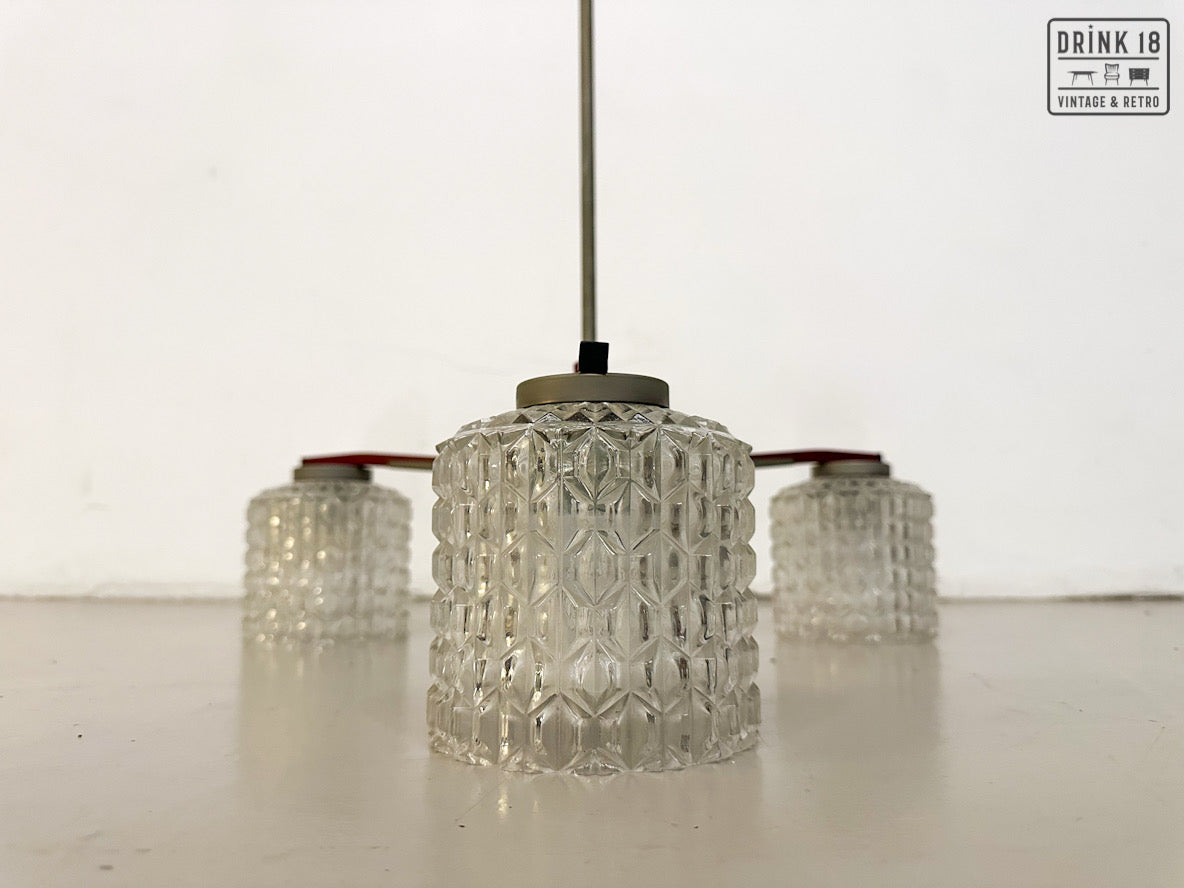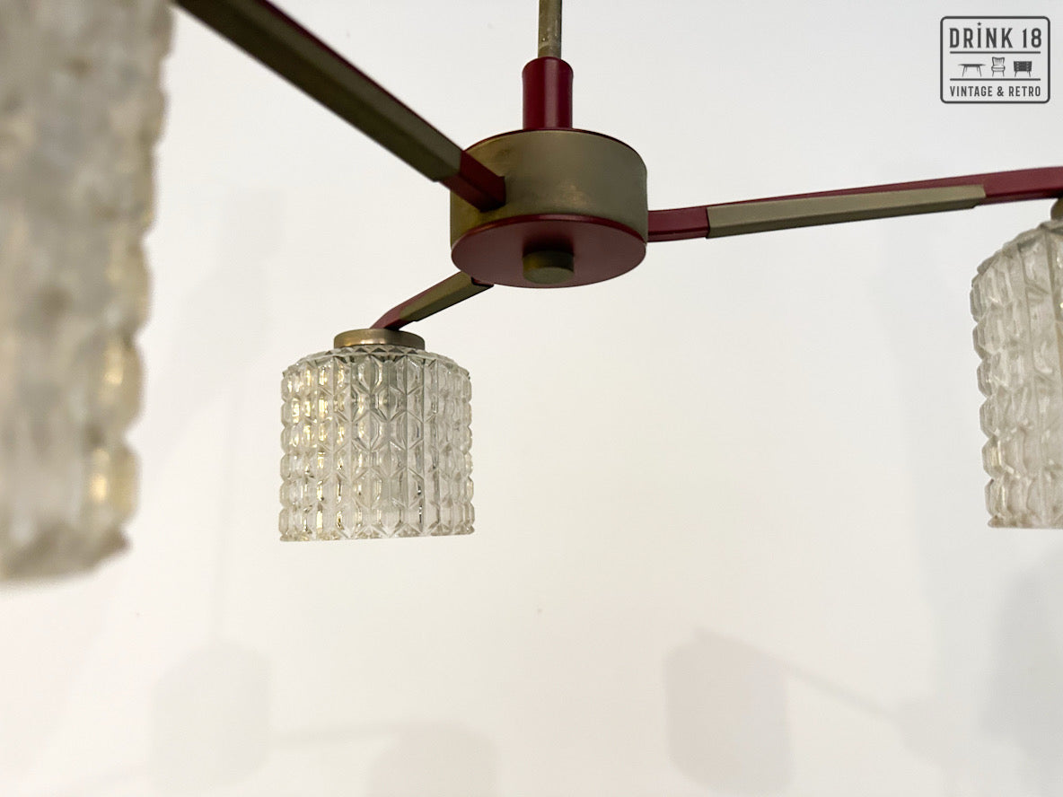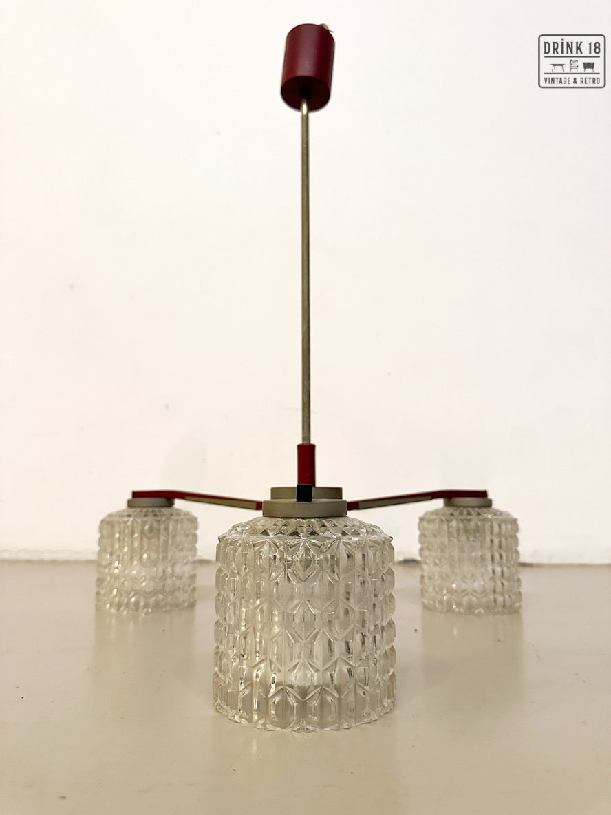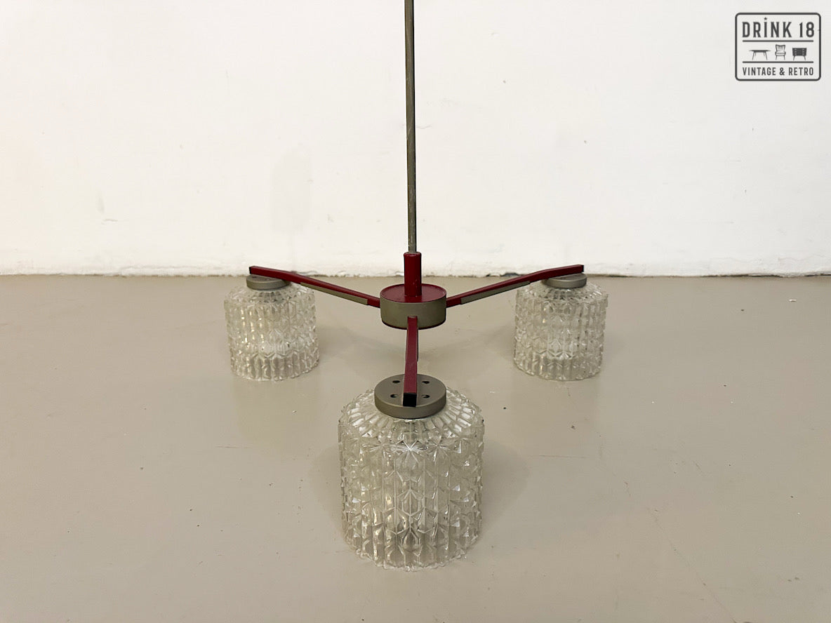 Deze vintage hanglamp is een prachtig voorbeeld van design uit de jaren '60 of '70. De lamp heeft een stevige, metalen basis in een bordeaux kleur, met drie armen die speels uitsteken. Elk uiteinde heeft een fraaie, gestructureerde glazen kap, die een zacht, warm licht verspreidt.