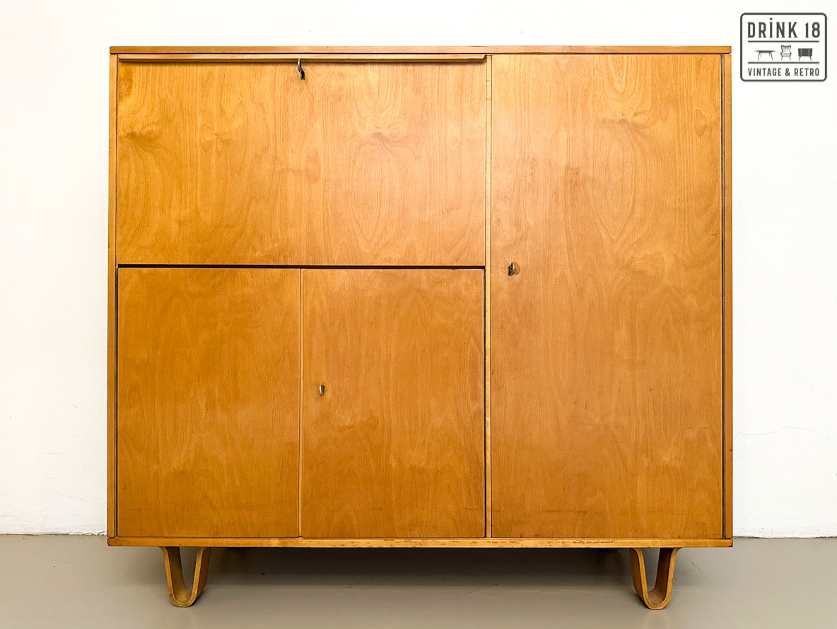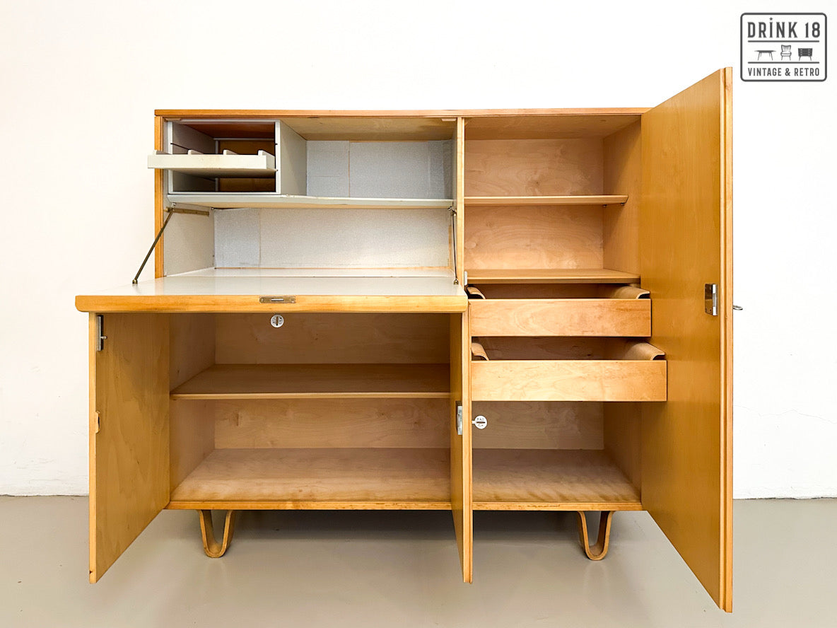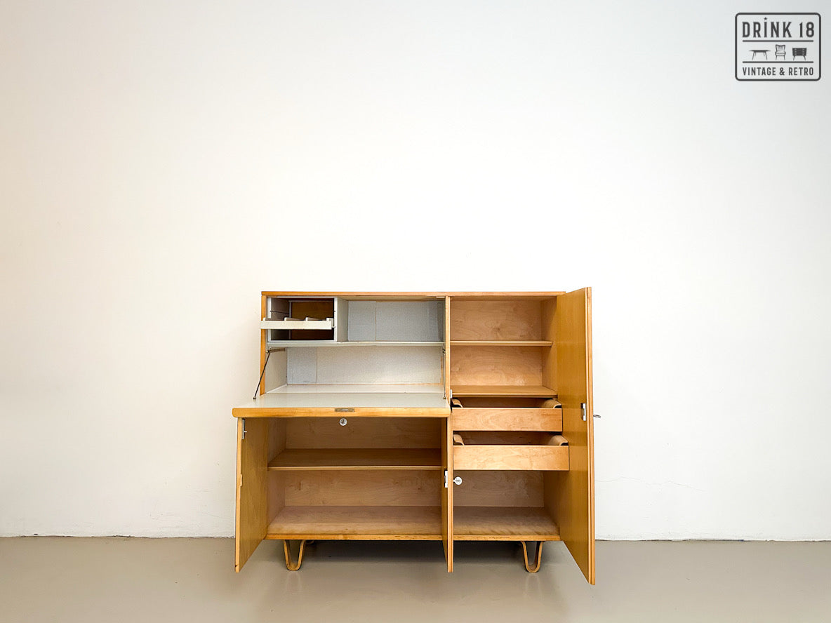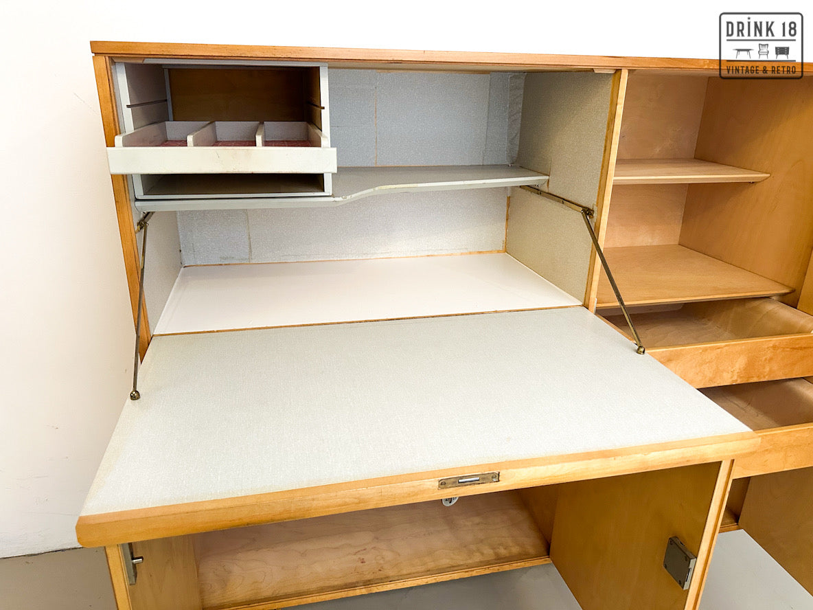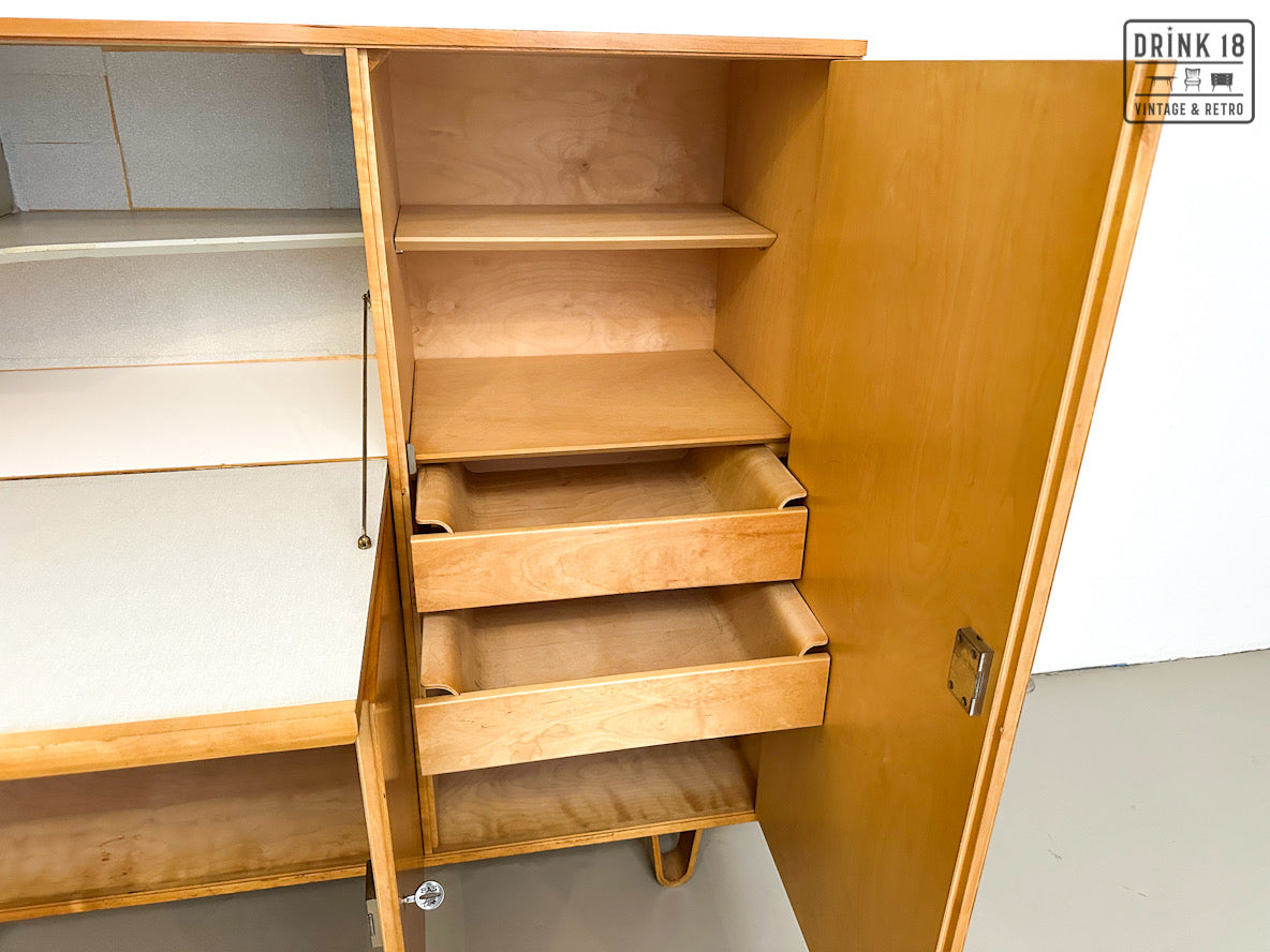 Een unieke kans om een iconisch stuk Dutch Design in huis te halen! Deze zeldzame 50’s CB01 wandkast van Cees Braakman (Pastoe) is uitgevoerd in berken en berkenfineer en combineert een strakke, tijdloze look met slimme functionaliteit. De klepdeur transformeert in een handig werkblad – ideaal als bureau, secretaire of bar.