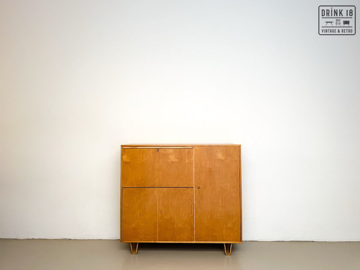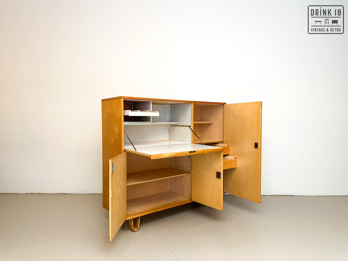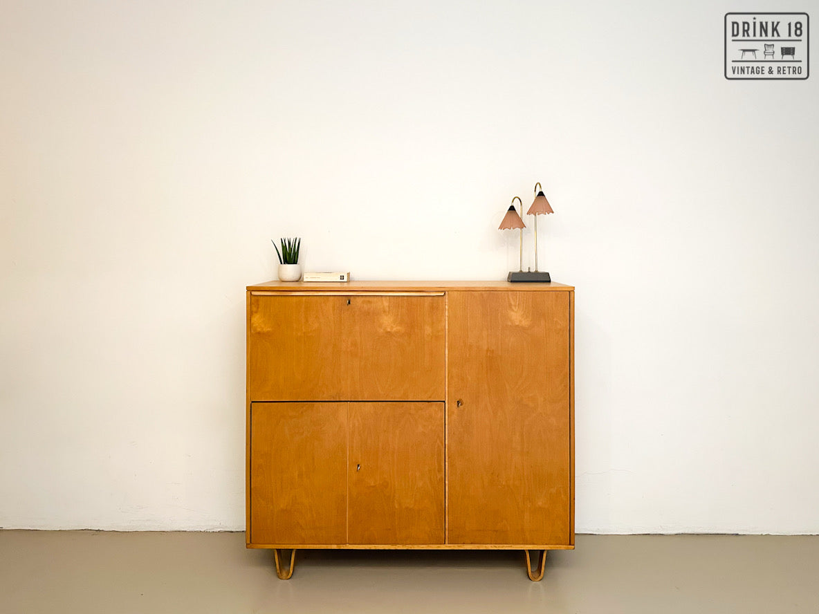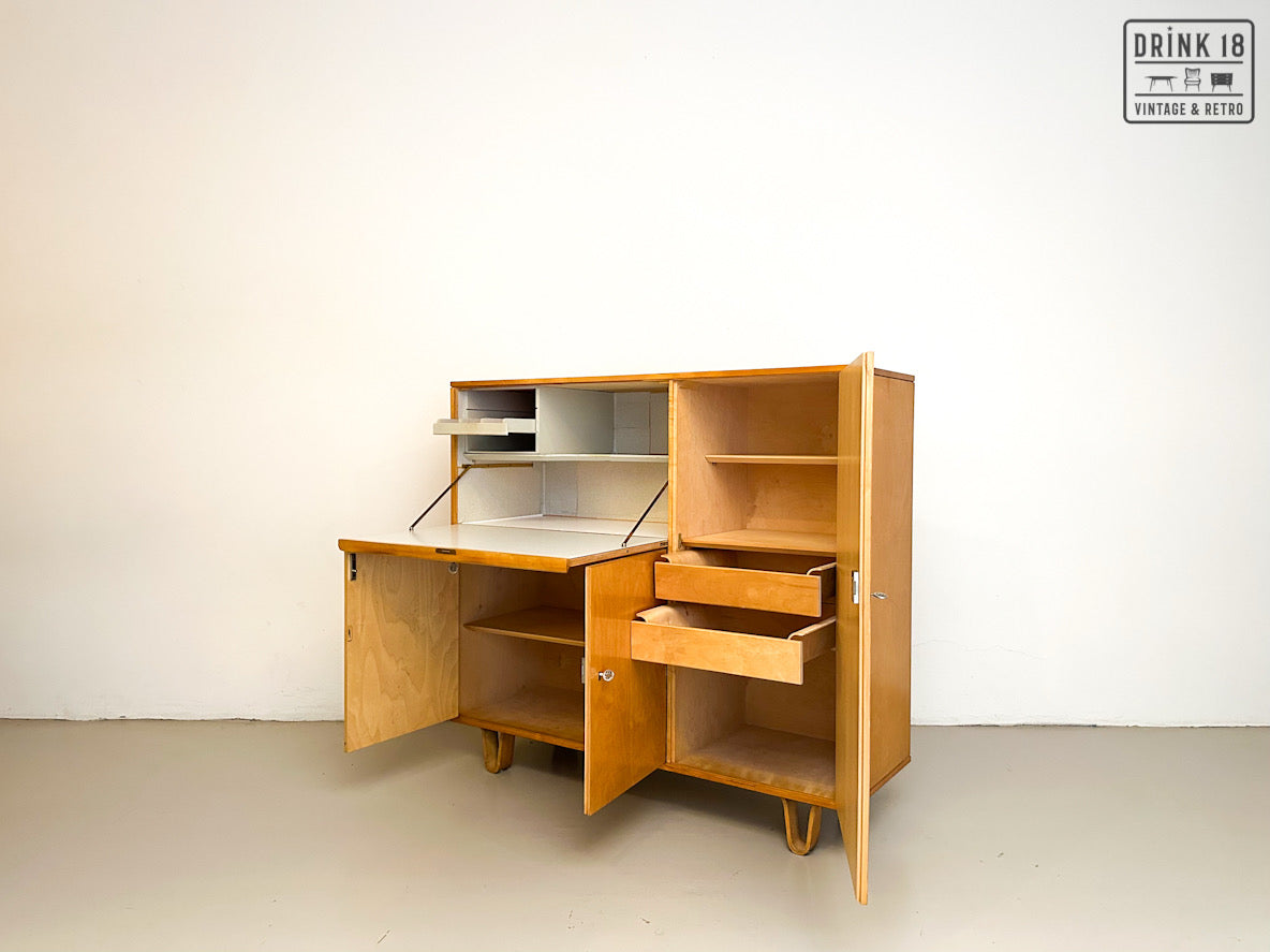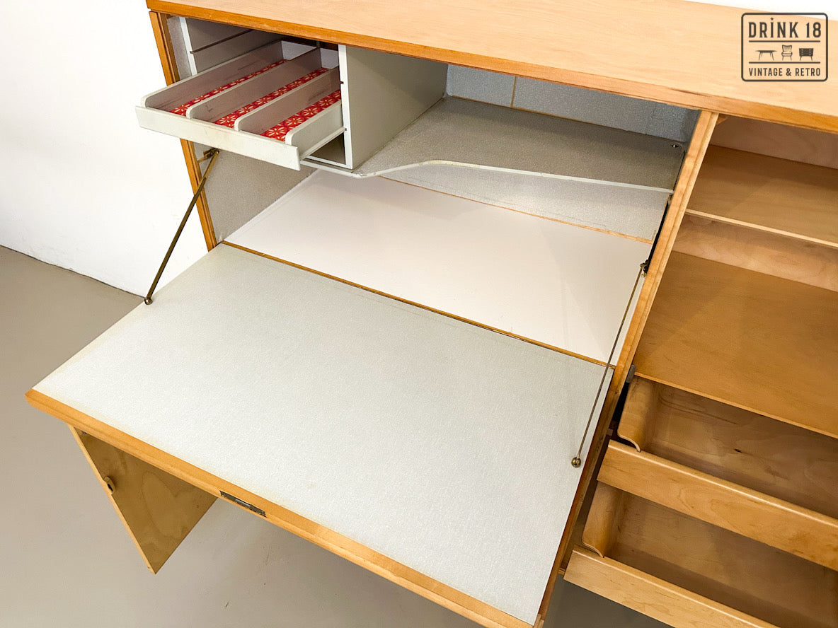 Een unieke kans om een iconisch stuk Dutch Design in huis te halen! Deze zeldzame 50’s CB01 wandkast van Cees Braakman (Pastoe) is uitgevoerd in berken en berkenfineer en combineert een strakke, tijdloze look met slimme functionaliteit. De klepdeur transformeert in een handig werkblad – ideaal als bureau, secretaire of bar.