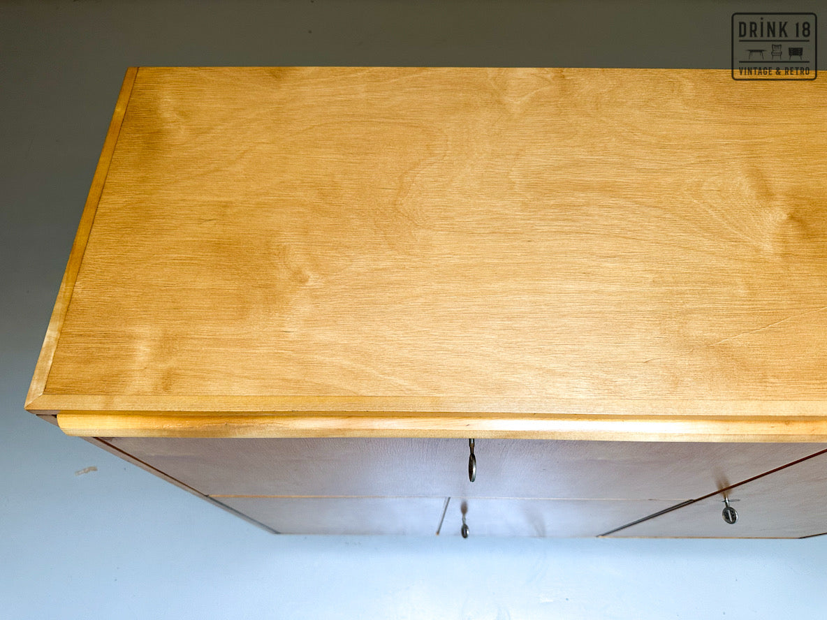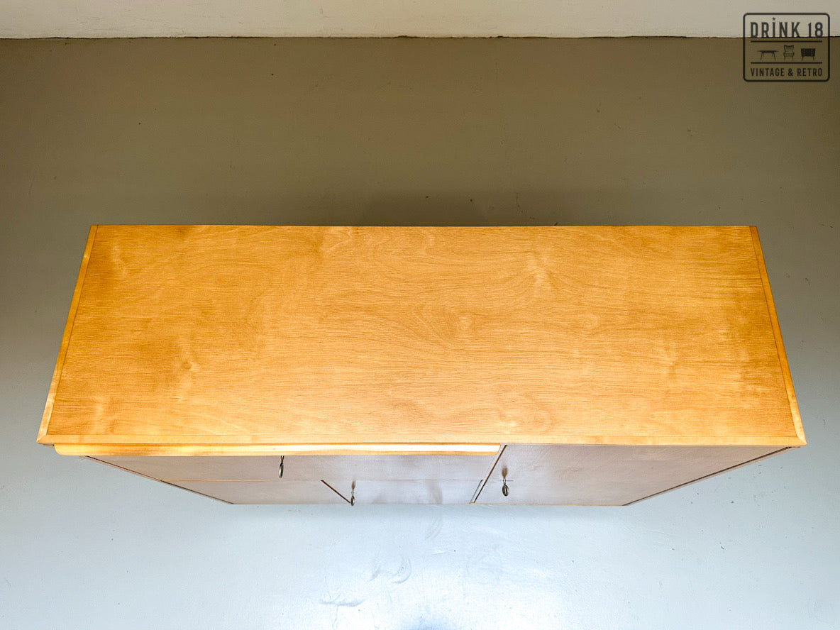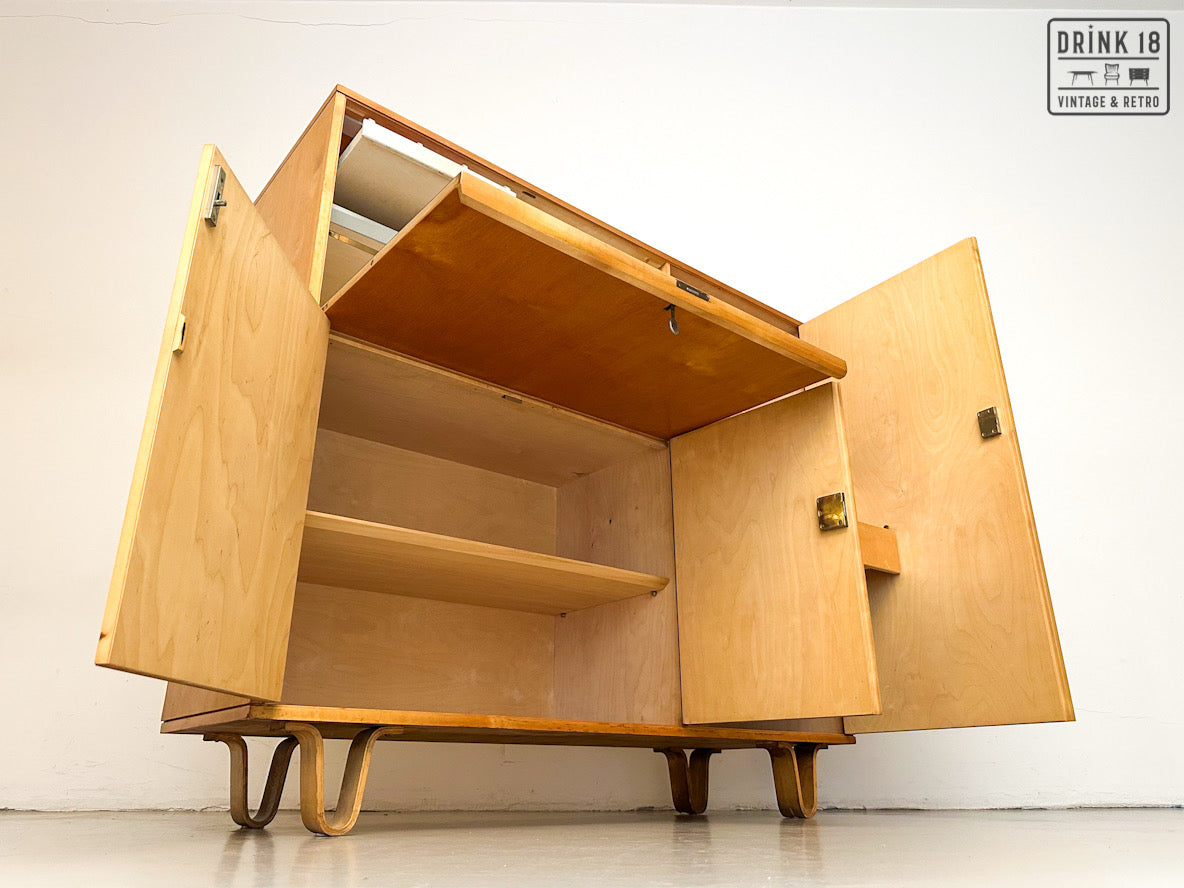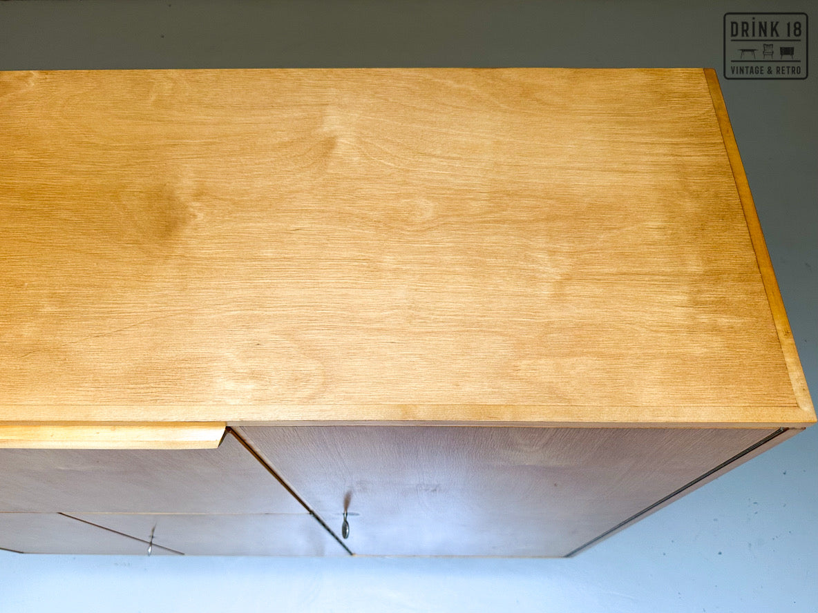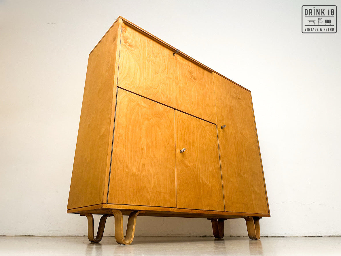 Een unieke kans om een iconisch stuk Dutch Design in huis te halen! Deze zeldzame 50’s CB01 wandkast van Cees Braakman (Pastoe) is uitgevoerd in berken en berkenfineer en combineert een strakke, tijdloze look met slimme functionaliteit. De klepdeur transformeert in een handig werkblad – ideaal als bureau, secretaire of bar.
